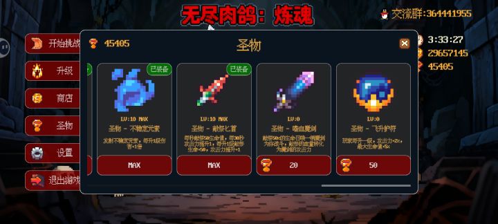 这游戏比较简单,没有什么特别难搞难钻研的机制,说说自己的心得。首先除了增强宠物的,其他所有圣物都有它存在的重要性,能点满全部点满,另外个人感觉最重要的是爆炸伤害,其次是经验倍率,其他内容都是浮云,而且主要是局外数据,局内数据只能说到后面聊胜于无,但等级还得升,影响血量,血量很重要,低了容易被秒;但血量高了也容易被秒,这就不得不说到霸王弓,后期想不被秒的话击退必须拉满(远程),因为容易被近战bos