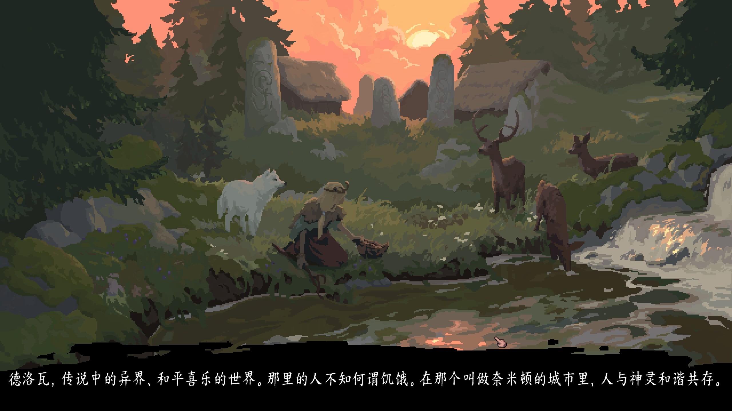 游戏引用的是凯尔特神话,所以会有很多树怪、兽灵的存在,周围的一些符文也都是卢恩符文。故事的开局也挺惊险,主角无意中看到村里的两名德鲁伊在半夜去了神秘的地方,他也就偷偷跟上,没想到这个迷雾地区充满了惊险,男德鲁伊很快就死了,女德鲁伊看到主角随机达成合作继续往里冲,千钧一发之际两人合力引发了传送符文,来到了一个被称为“理想国”的drova位面,可惜女德鲁伊在传送过程中已经受了重创,临死前把交付水晶的任务交给了主角去完成,就这样,等待主角的冒险就此开启。