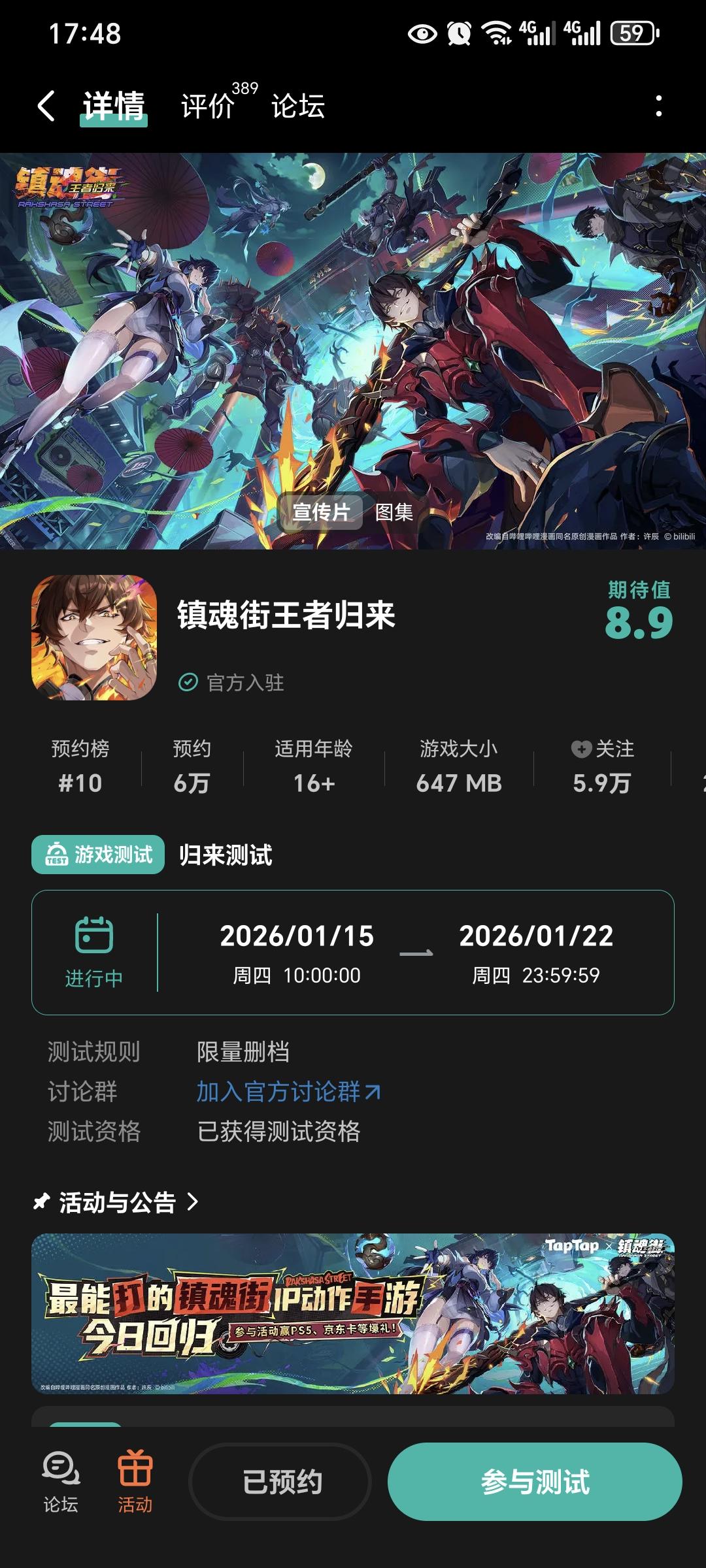 Hi,镇魂将们:《镇魂街:王者归来》「归来测试」招募正式开启啦~欢迎各位镇魂将积极参与报名,您的建议与反馈将很有可能影响正式版的方向和内容哦!🔥游戏预约及测试资格传送门:【招募说明】测试类型:本次测试为限量删档·不计费测试测试平台:安卓招募时间:2025年12月27日-2026年1月14日测试时间:2026年1月15日10:00 -1月22日 23:59【互动有奖】🔥评论区聊聊你