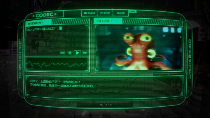 主角是章鱼,那主角的一切机能就要符合章鱼的特点,在游戏中,玩家可以操控达尔文钻过一些管道通路,到达另一边,同时还可以借助触手的吸盘吸附在一些管道等可交互的物体表面,达到飞檐走壁的效果。同时达尔文还可以使用触手搬运一些不算重的物体,但一次最多只能搬运一个,使用那些物体来达到交互效果或者遮蔽敌人的视线,在很多场景中都有很好的运用。但这能力在后面会有一个平替,在一段进度之后玩家可以解锁一个喷墨的能力,也可以短暂遮蔽摄像头的视野。