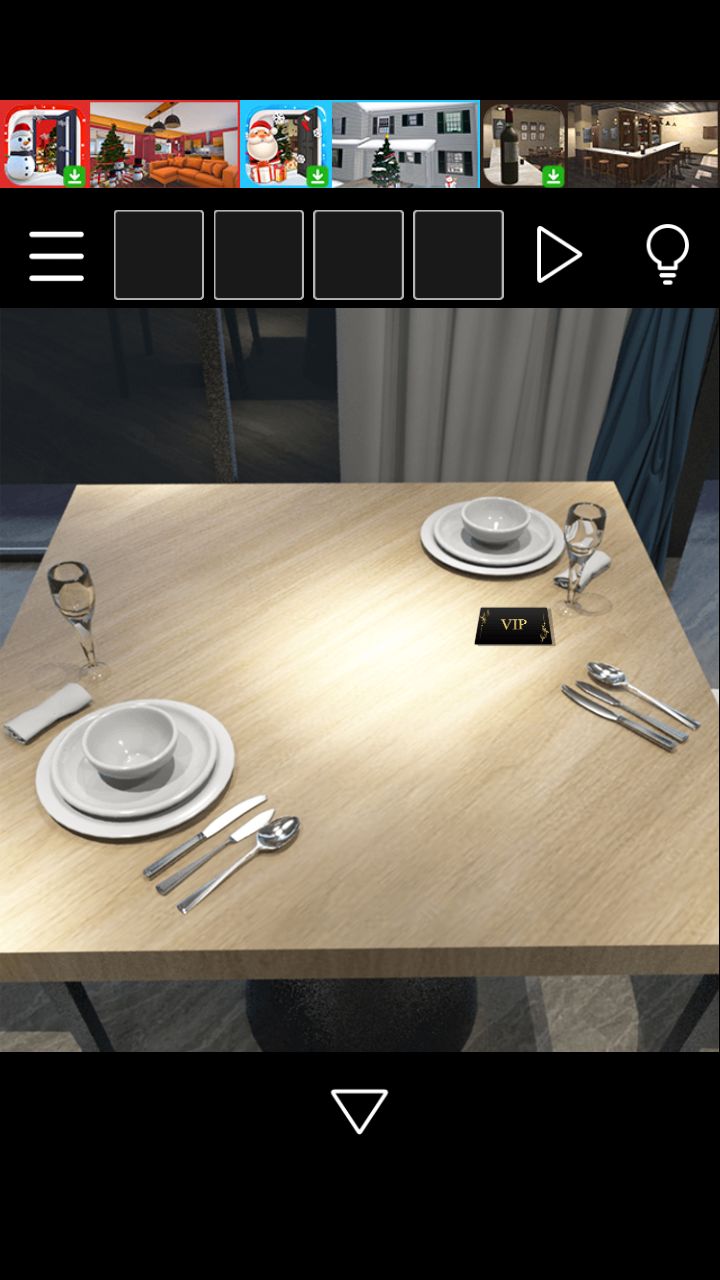 桌子上拿到VIP卡,旁边花瓶底下拿到第一个硬币往右边走,如图椅子底下拿到第二个硬币,继续往右到有玻璃门的房间,右边柜架子上拿到第三个硬币,左边葫芦的位置和右边方块的位置是对称的,按方块个数排序得到葫芦的顺序,右右左左左中,到下一个房间打开中间的柜子,得到红酒右边架子上放巧克力的盘子上拿到第四个硬币,观察巧克力摆放空隙得到左边柜子密码是532,打开得到可可粉继续往右去前台,刷卡得到礼物盒,密码