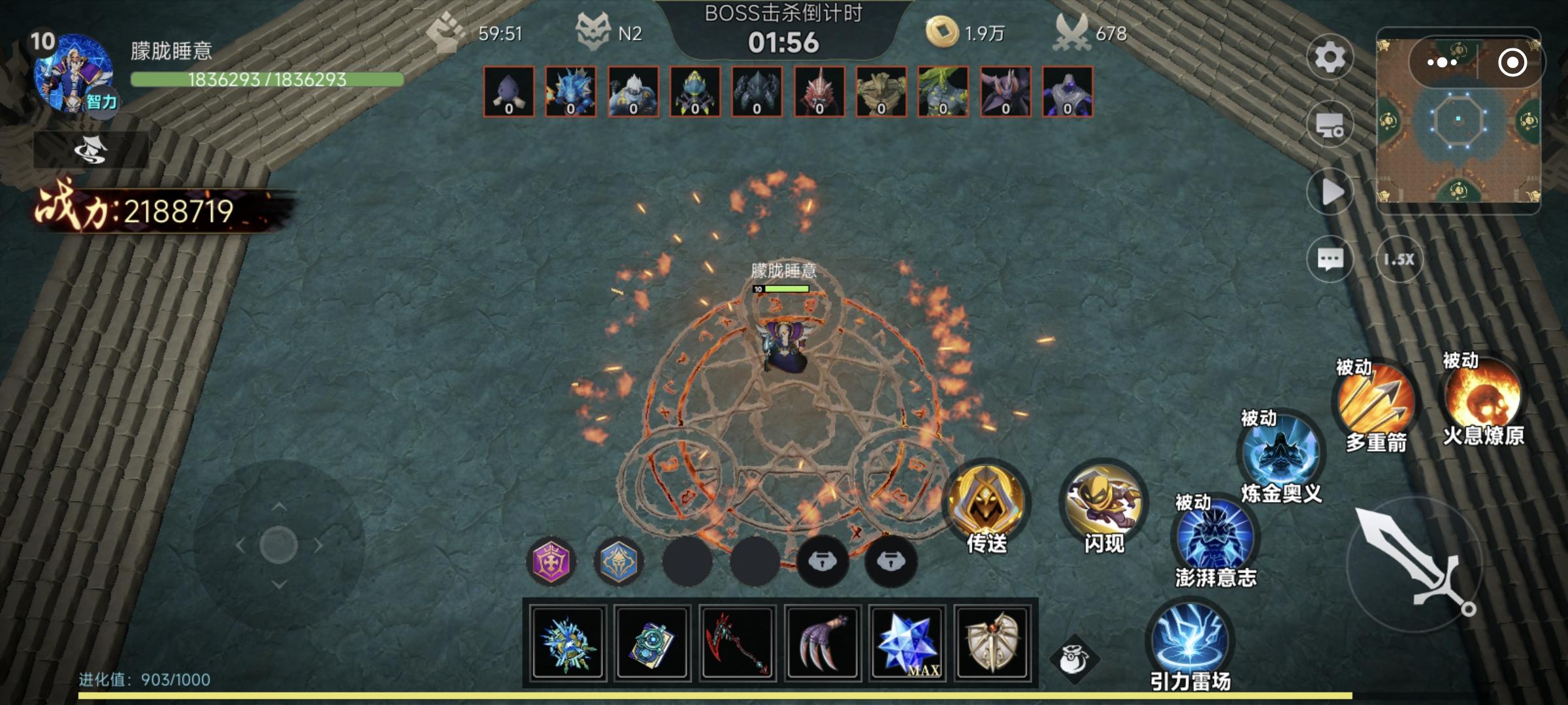 1、 进地图泉水位置会自动回血,没血回去泉水;技能旁边的传送要长按拖到传送点就可以传送,地图可以看到有8个传送点,上下左右是泉水,四个角是商店,功能都一样 2、前期要保证小怪一刀一个,买一级武器、攻速、护盾各一个,可以点装备栏武器升级,装备不要怕买错,卖是原价卖的,所有搭配可以自己尝试,N1没啥难度重点在下一步。 3、第一次进化要选群攻的英雄快速清怪(进化时候可以不继承技能,第三次开始没100