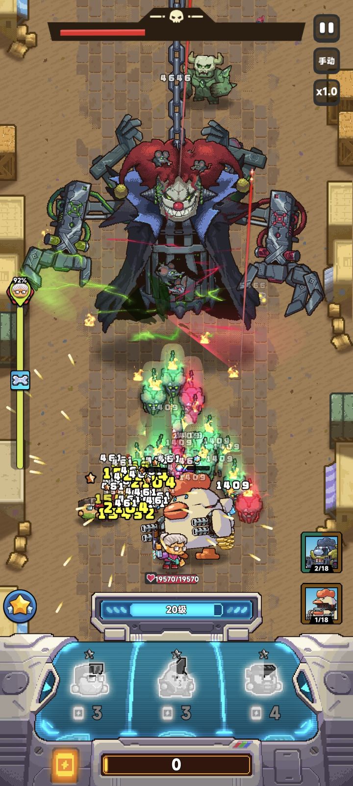 由于目前游戏bug严重。。。舍弃机甲,只能靠不升星人海战术来打! 进游戏给的第一个技能是无效的!!!只要角色不在场,选择的本角色技能是吃不到加成的!!所以第一个技能别浪费刷新次数,选个最垃圾的!!!! 技能方面 机枪:就开局用一下,技能无所谓。。。因为大多数局里面通关也就18级左右,选择次数就那么多,机甲又不能继承技能,就别浪费在这上面 炸弹人:优先选择晕眩跟晕眩+1技能,额外选择加范围,加丢炸弹