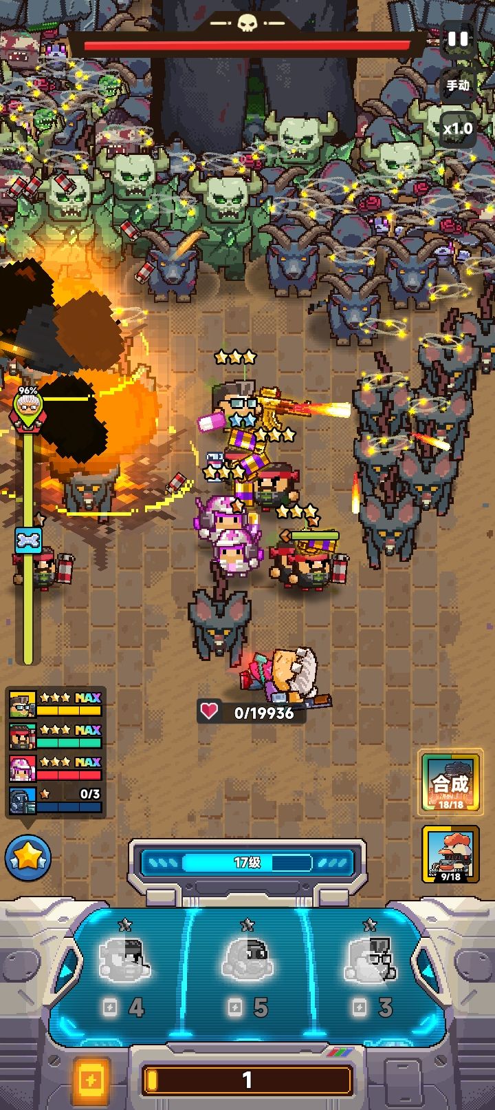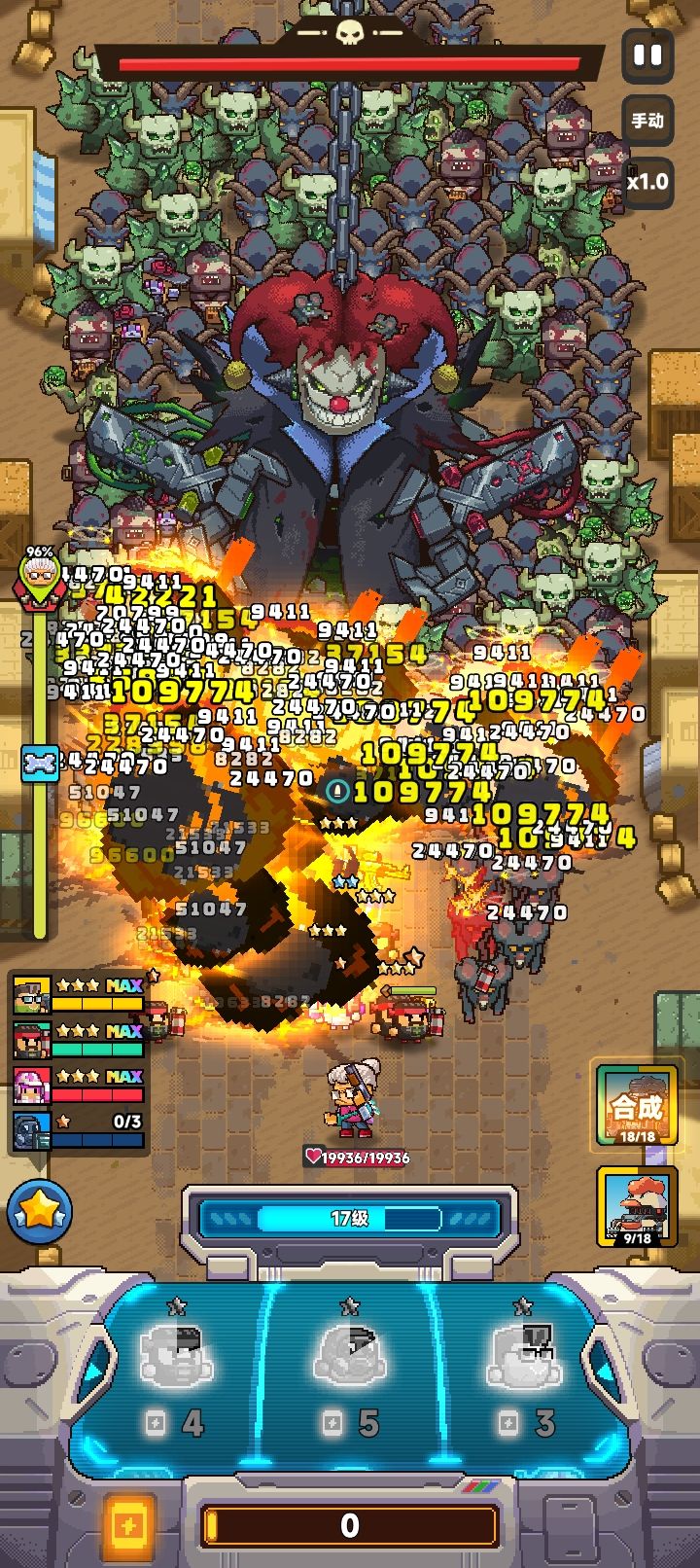 试了两天,就用初始两个输出角色,带两个奶,尽早合出来两个机甲,剩下就靠技能跟机甲输出了,多余的能量在加其他角色,一定要多加点奶保证机甲的血!