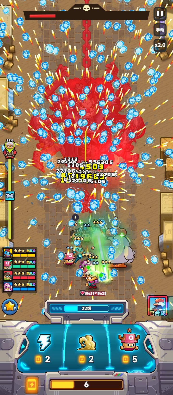 如图,通关人物等级,机甲。。。开局以枪手为主,出个奶妈,然后靠吹风,晕眩拉时长。。。优先2级枪手,1级奶妈,保证不死的前提下,能不用滚筒尽量不用(输出不足的情况,遇见那个召唤怪近身,才用滚筒吧)。。。因为怪杀的太快,不容易发展起来。。。这阵容主要靠炸弹人,技能选择一定选择最高星晕眩一秒,后面还有晕眩+1秒的一起拿了,这2个是核心技能,出了这2个以后,选择加炸弹范围的(就是为了打boss那里能大