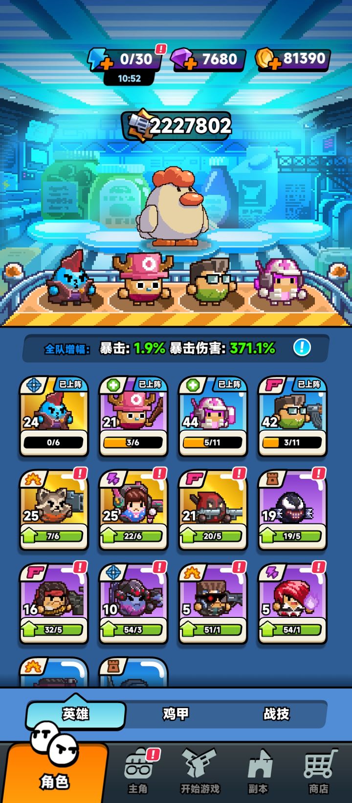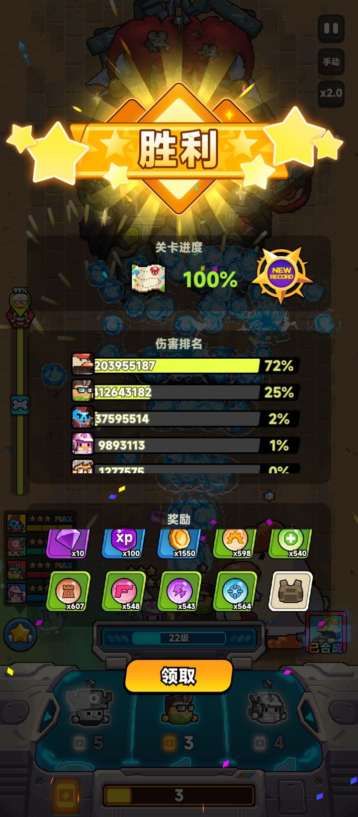 看大佬攻略,终于在新年的第一天过了三十关,打完之后才看见开一倍速可以增加容错。队伍如图,就是前期只出机枪和治疗,尽量快速合出机甲,攒能量对付最后boss。最终boss的不得了,多刷几次就过了。