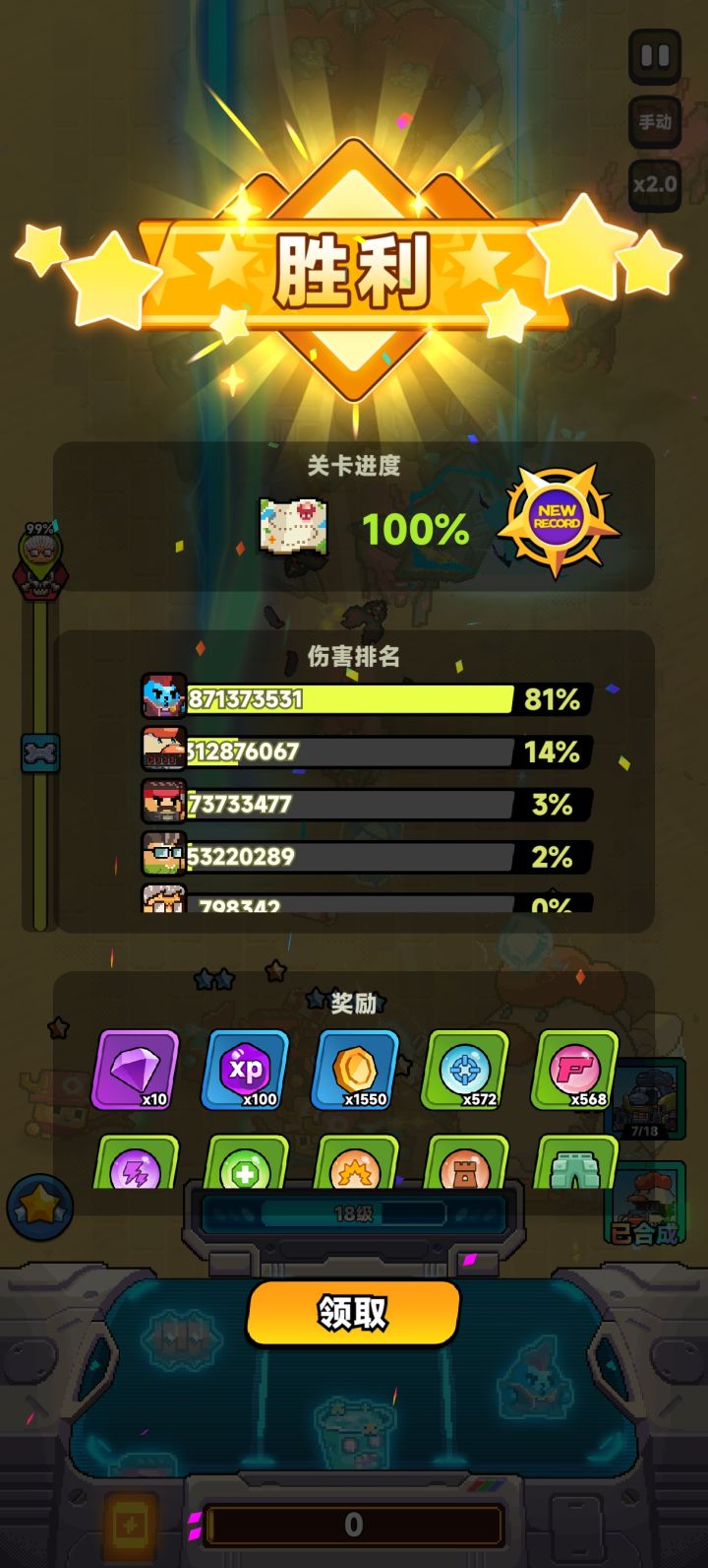 怎么说呢,首通那个100001确实有东西,用他的这套的话勇度刮的很快然后费低补一点伤害很容易打到boss关。然后勇度也可以换成那个新手炸蛋的那个,关键词条是最高星可以打出一个控制,然后他手比较长,可以开手动合成,全一星放那打控制让匪徒蛋慢慢刮。再说一倍速确实有说法,原先打这个第三十关的话在40%的时候我的阵容只要没到三星就会给那个关隘一炮秒掉导致我后面机甲搓不出来,但是现在开一倍速就不会这样给秒