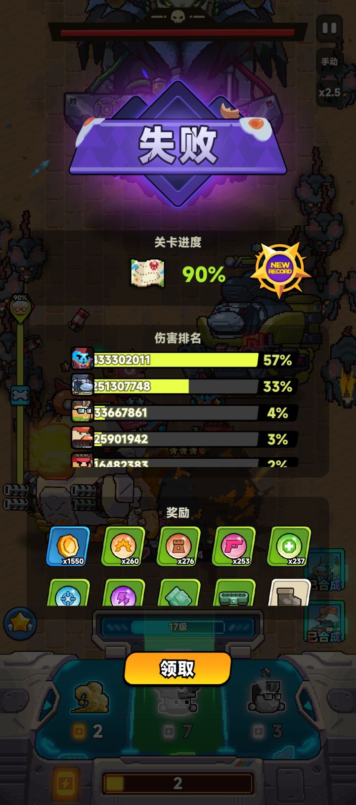 看大佬攻略,终于在新年的第一天过了三十关,打完之后才看见开一倍速可以增加容错。队伍如图,就是前期只出机枪和治疗,尽量快速合出机甲,攒能量对付最后boss。最终boss的不得了,多刷几次就过了。