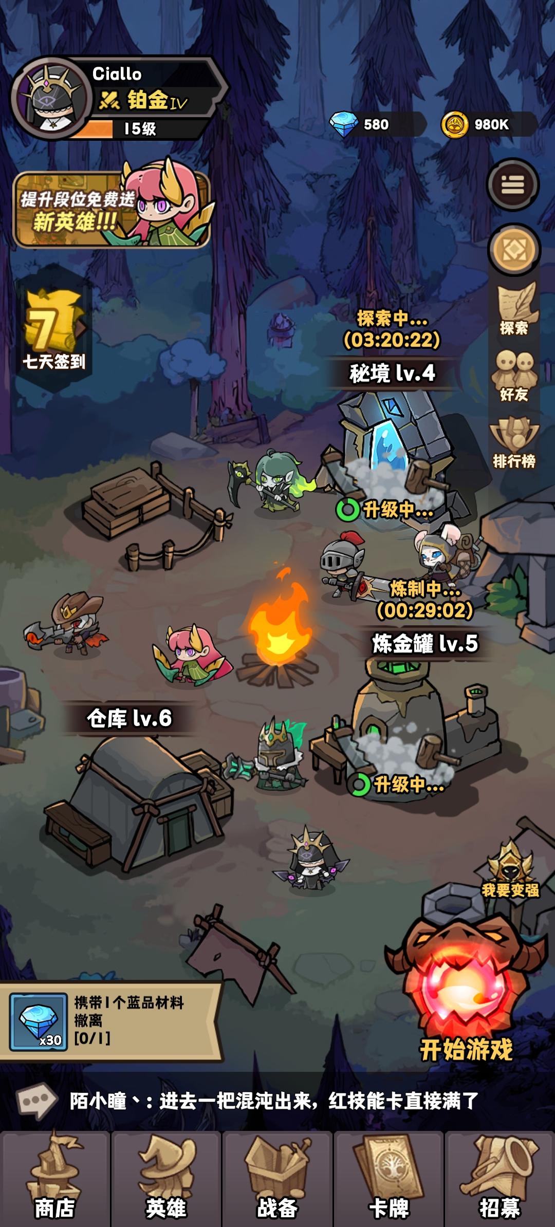 一切资源都等从对局中获得(卡,消耗品和材料卖金币,红色升级材料卖钻石,金色升级材料混沌出,概率挺高,红色升级材料混沌钥匙宝箱出,概率极低)