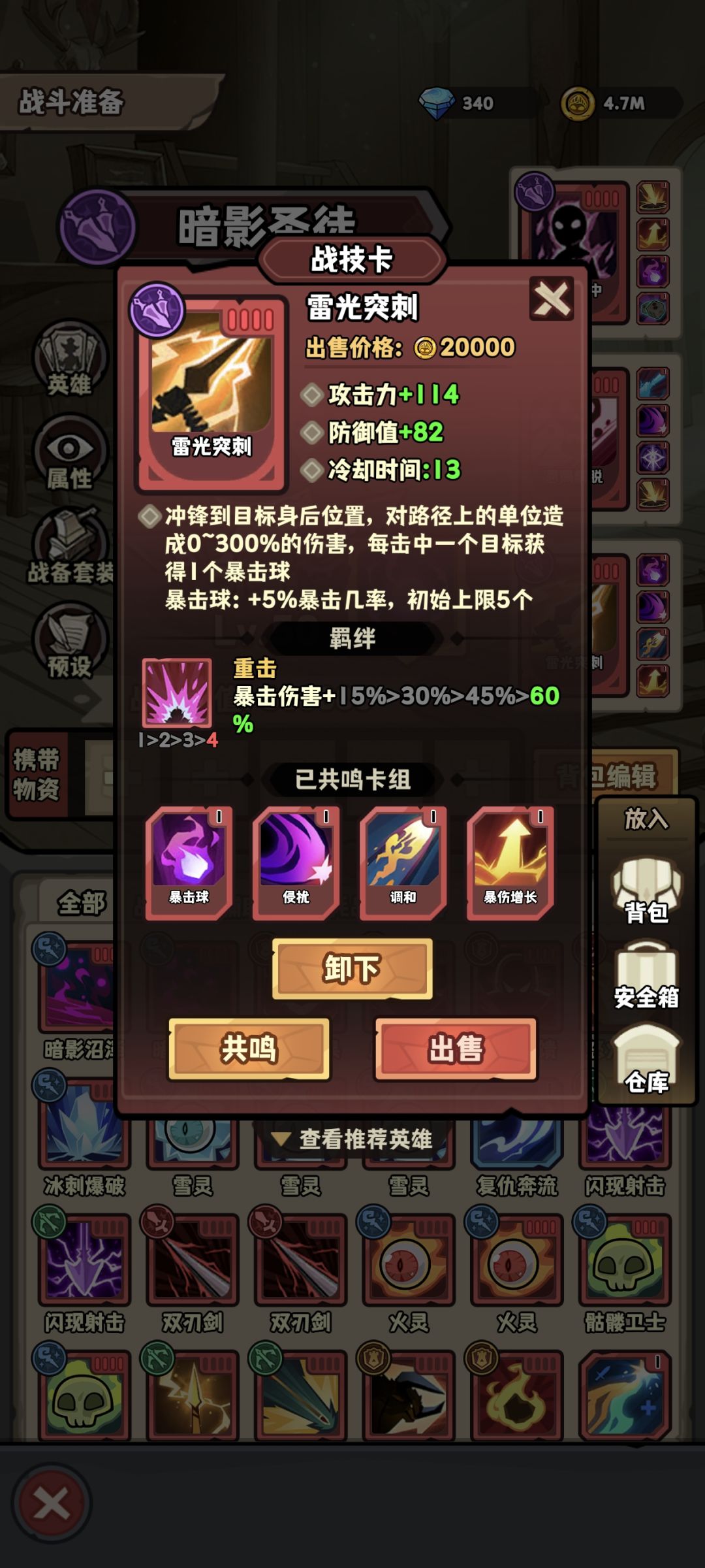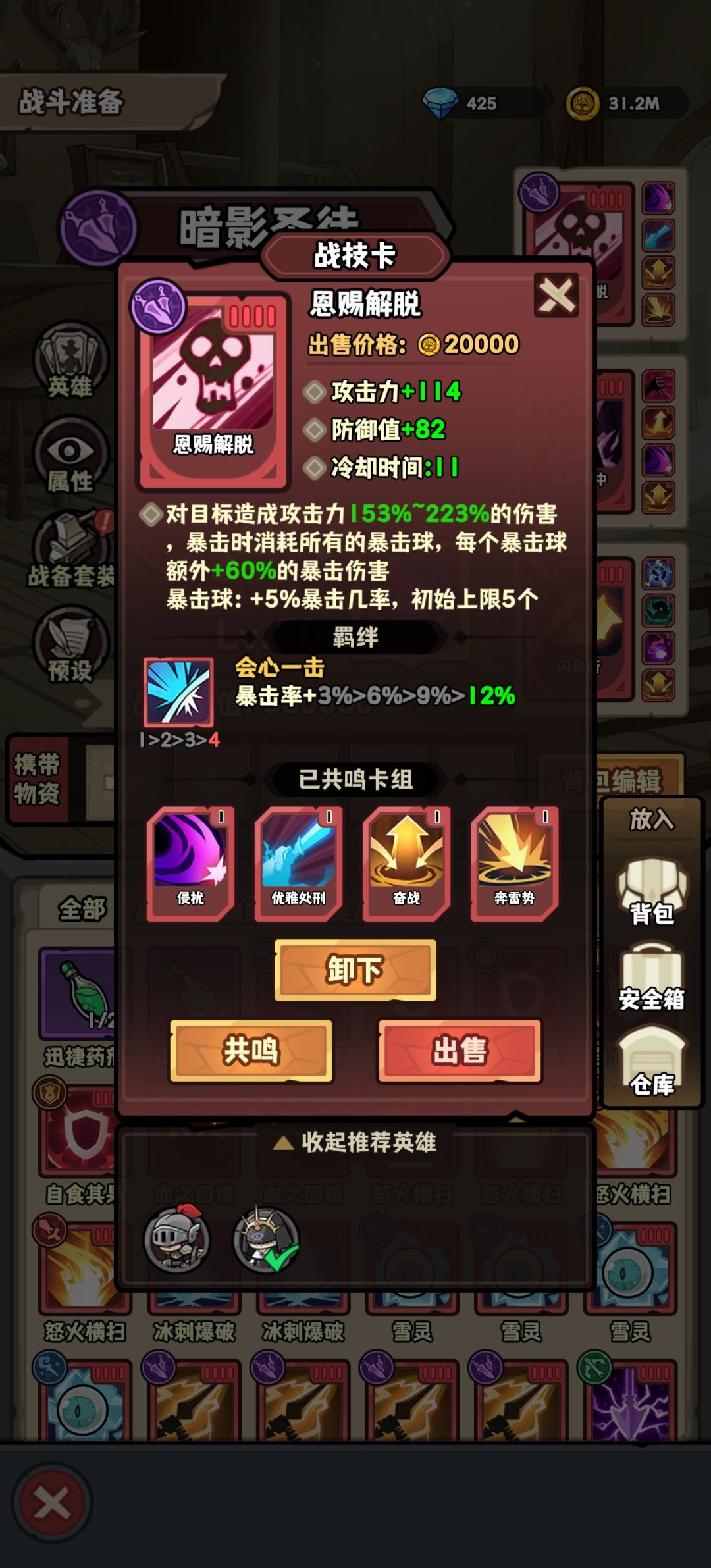 依靠暴击球和暴击增长可以叠加高额暴击率和爆伤,攻击;隐身可以免疫掉大部分攻击;再配上我们的bug卡牌闪身斩能一直触发某些特定的卡牌(平a一下就能触发),我这里选择了隐身加净化增加大幅度提高生存能力,风暴让刺客也不怕团战,加上暴击增长没有上线限,理论上可以叠出高额伤害,pvp和无限影身的恩赐一刀流刺客55开。