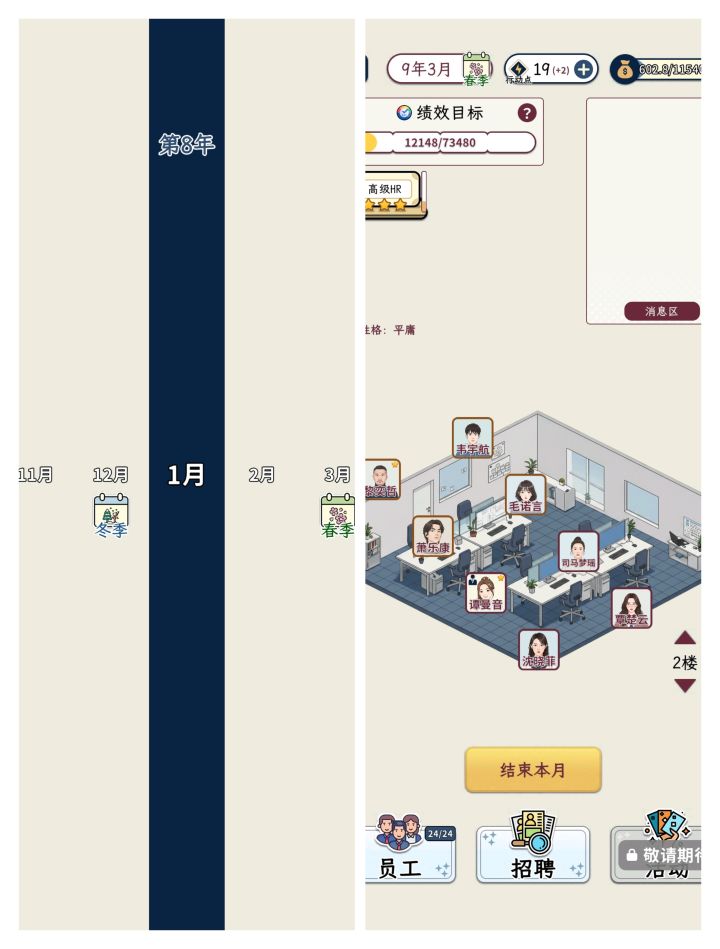 3.这个月份的过场动画有点呆板无聊,而且看不出月份在游戏的重要性,如果非要设计过场动画,一定要在游戏中发挥月份的【功能性】,动画可以只安排在春秋两季,其他月份不重要可以选择跳过,现实中企业单位一般都有春招秋招,也有俗称“金九银十”,游戏可以着重在“春招秋招更容易招到优秀员工”。