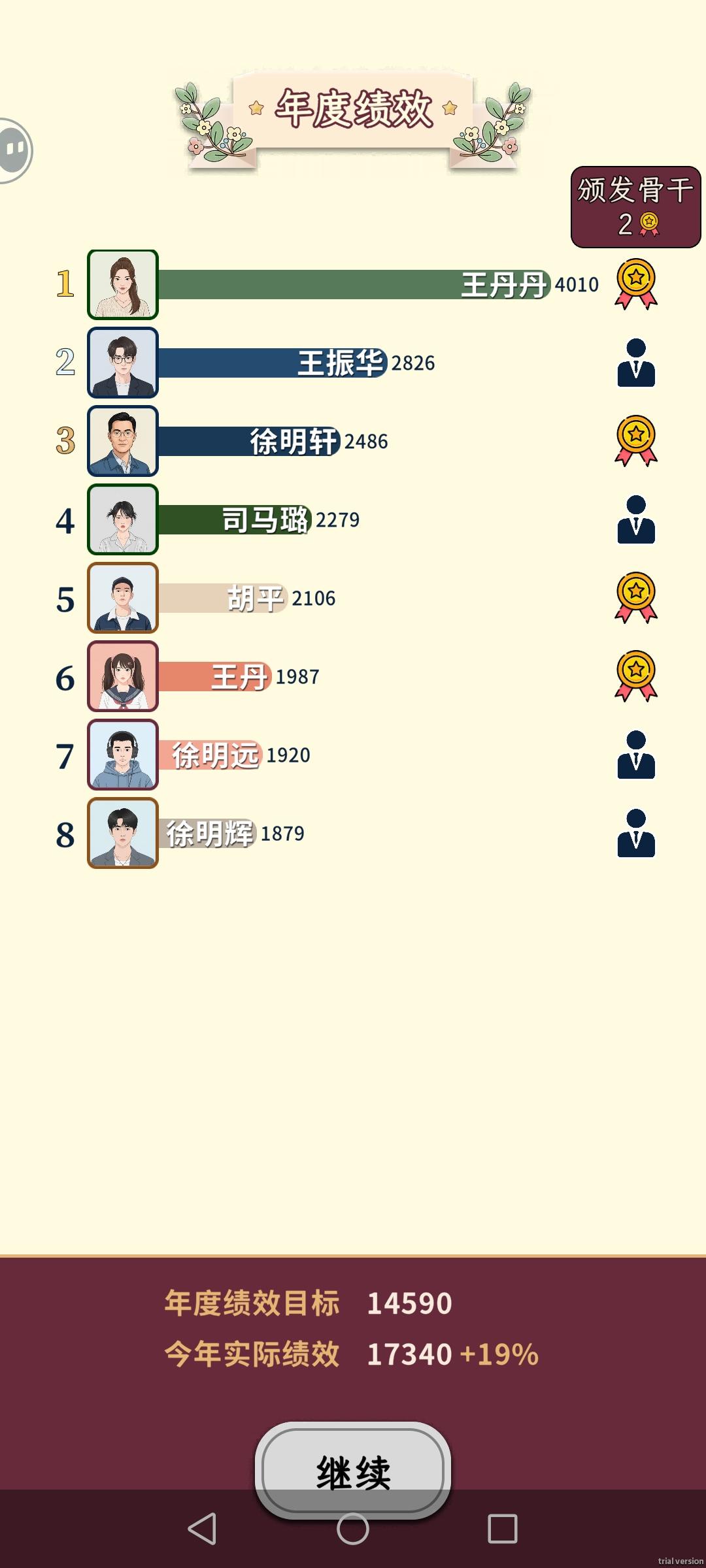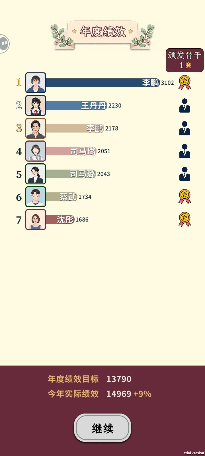 新版本已提交审核,通过后立即上线,需要强制更新一下,存档应该是兼容的。该版本修复了一大堆问题,已经数不清了...包括但不限于:年度总结文本展示骨干勋章错误发给主管(并导致其他地方一系列问题例如无法任命新主管)读档时消息丢失或展示时间错误解雇谈话在开头卡死(由于解雇员工带有撤销解雇相关承诺)第二年开始冬季绩效结算显示错误承诺条目文本重叠面试评价原本做的说明按钮不知道被谁关掉了其他
