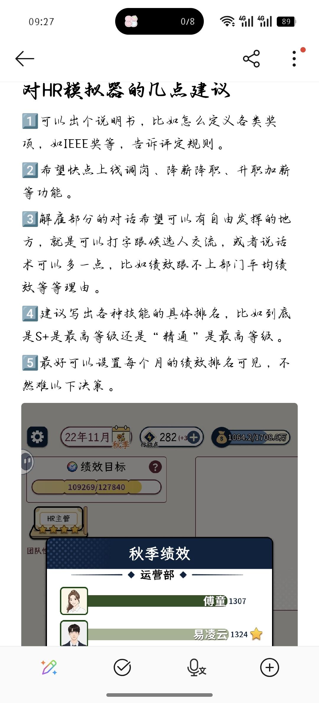 对HR模拟器的几点建议1️⃣可以出个说明书,比如怎么定义各类奖项,如IEEE奖等,告诉评定规则。2️⃣希望快点上线调岗、降薪降职、升职加薪等功能。3️⃣解雇部分的对话希望可以有自由发挥的地方,就是可以打字跟候选人交流,或者说话术可以多一点,比如绩效跟不上部门平均绩效等等理由。4️⃣建议写出各种技能的具体排名,比如到底是S+是最高等级还是“精通”是最高等级。5️⃣最好可以设置每个月的绩效排