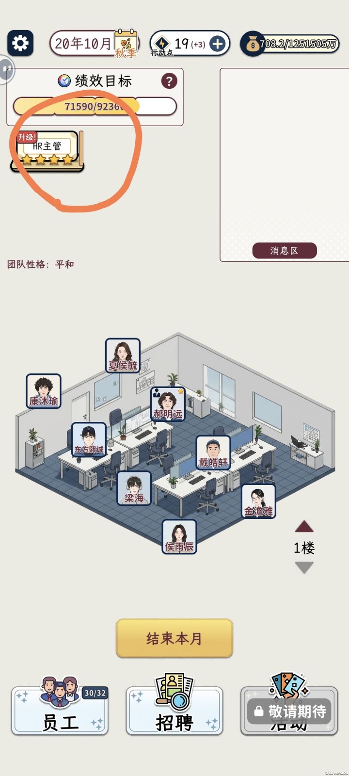 怎么说呢,玩了有一会了说说自己的感受吧,就是尽可能多招人,要上面这俩有能力,有野心又稳定的个人觉得野心=稳定>能力,基本上他们就是你的主力军了,目前最高等级是HR总管(四星上将)32人为上限 推荐慢慢换人 尽量等等看有没有人厚积薄发,除了上面这俩面板以外,还是也有其他t2打工人的,祝各位都能抽到像我一样的高能力高野心高稳定的打工人#游戏攻略
