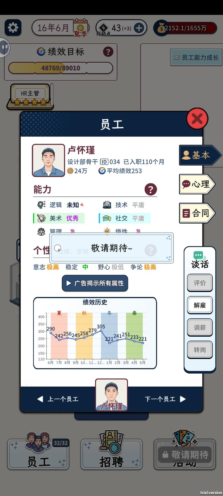 图上为我第一个极品人员六维。 《目前来说高管并不能控制任职》 《只能把一个高管撤职后,才能换人任职》 《剩下等更新》 只需要记住性格中稳定>六维悟性>一切。 就可以量产这种极品牛马 《第一部分》 《开局到三级怎么选择》 招聘平台容易出除悟性外的四维。 从而在前期实现基金快速积累。 但是年龄通常很大,需要的金钱也更多。 S+工资200万你敢信? 上图是我后面用校园招