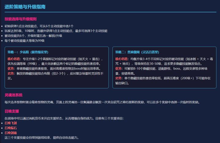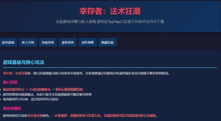 这是个幸存者类割草游戏,没有复杂的数值和操作,只需要在升级和配置时选择技能,不同的技能就会自动搭配,然后触发更强大的隐藏大招,痛快杀敌,割草解压,游戏和群内配置了大量的新手攻略和玩法资料,助你上手更轻松,群内定期更新福利码,如果不能运行游戏请更新TAP或者前往星火对战平台下载游戏开始游玩
