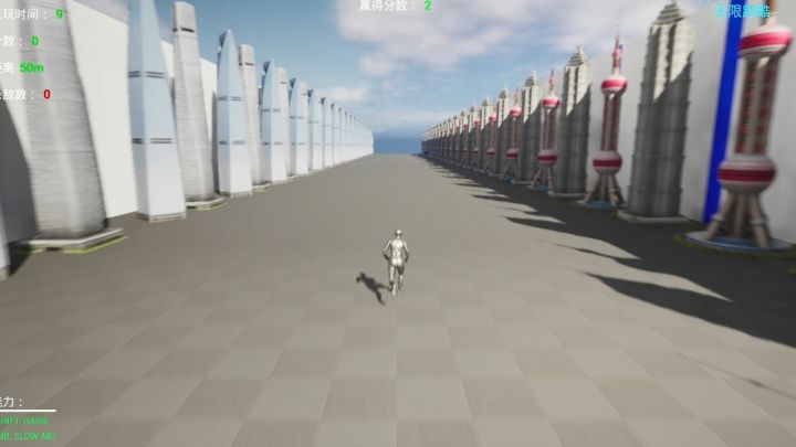 玩家是一名跑酷选手,徜徉在上海的马路上进行跑酷,需要躲避水晶并获取蓝色积分方块(如果同时躲避水晶和方块可以无限玩下去)