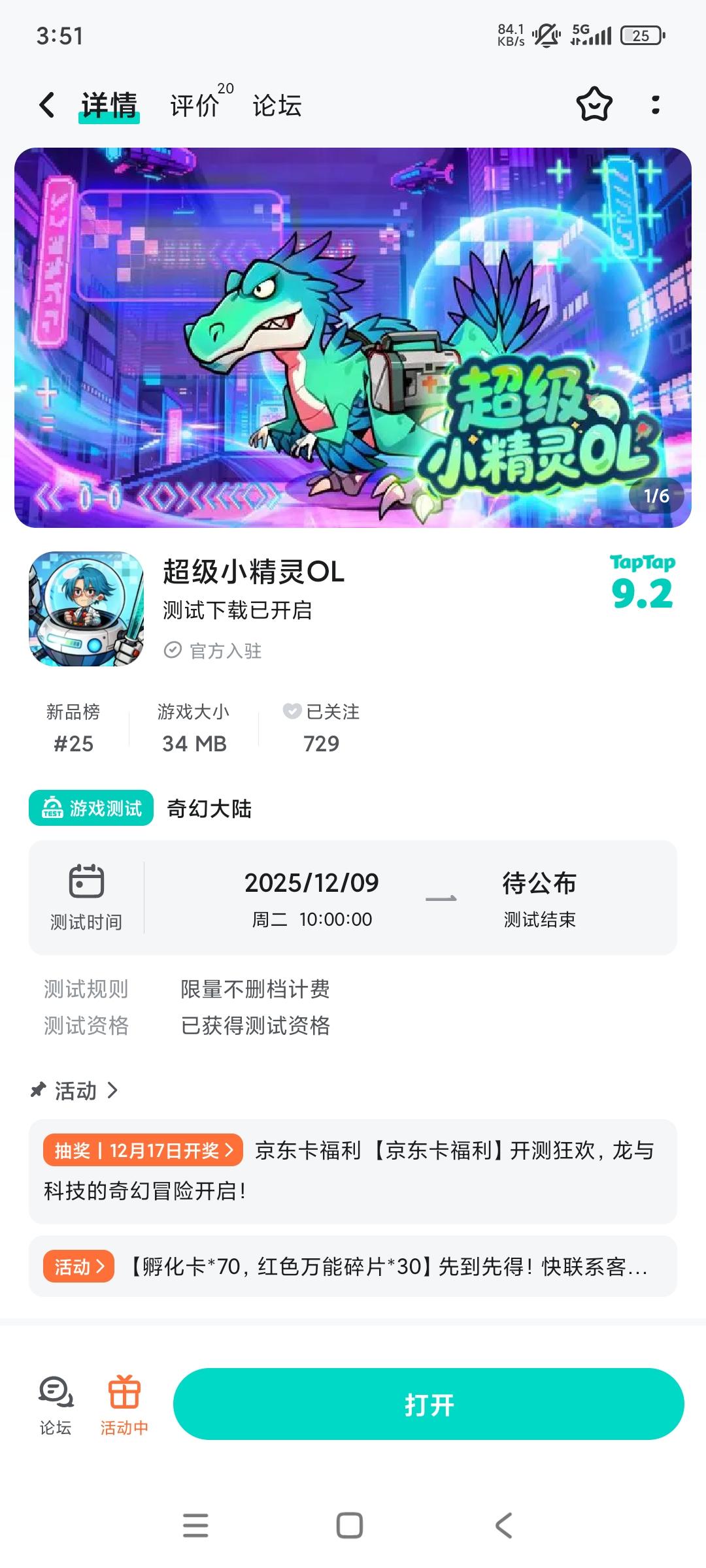 各位勇敢的驯龙者,准备好了吗?当远古巨龙遇上未来科技,一场颠覆想象的奇幻冒险正式拉开帷幕!每一片云层都藏着待驯服的巨龙,每一次探险都将解锁古老传说的新篇——我们的游戏震撼开测,为感谢各位驯龙者的热情支持,特此开启开测专属抽奖活动!⏰开测时间:2025年12月9日 10:00🎁 开测专属福利:【京东卡抽奖活动】▶ 参与方式1.点击关注发帖账号并预约《超级小精灵OL》且发新帖晒截图2.在本帖