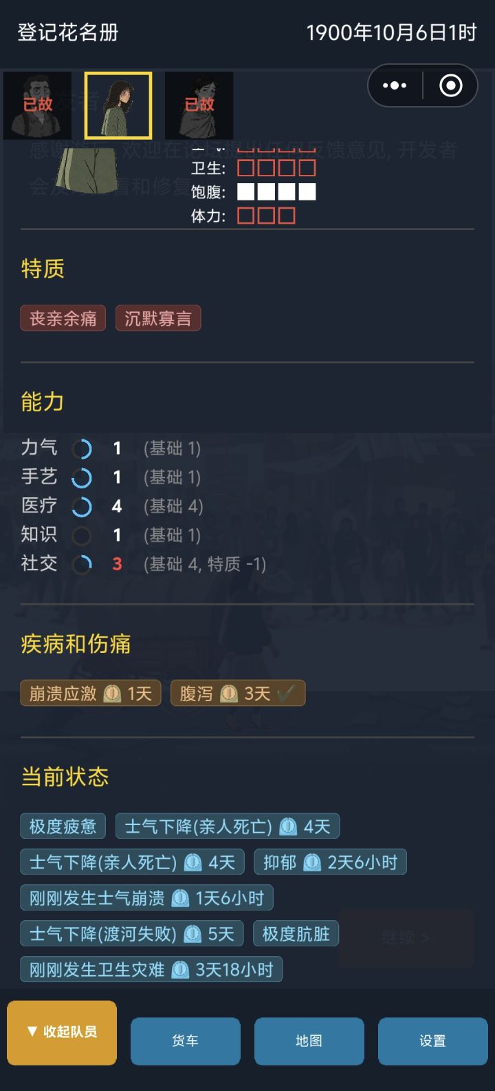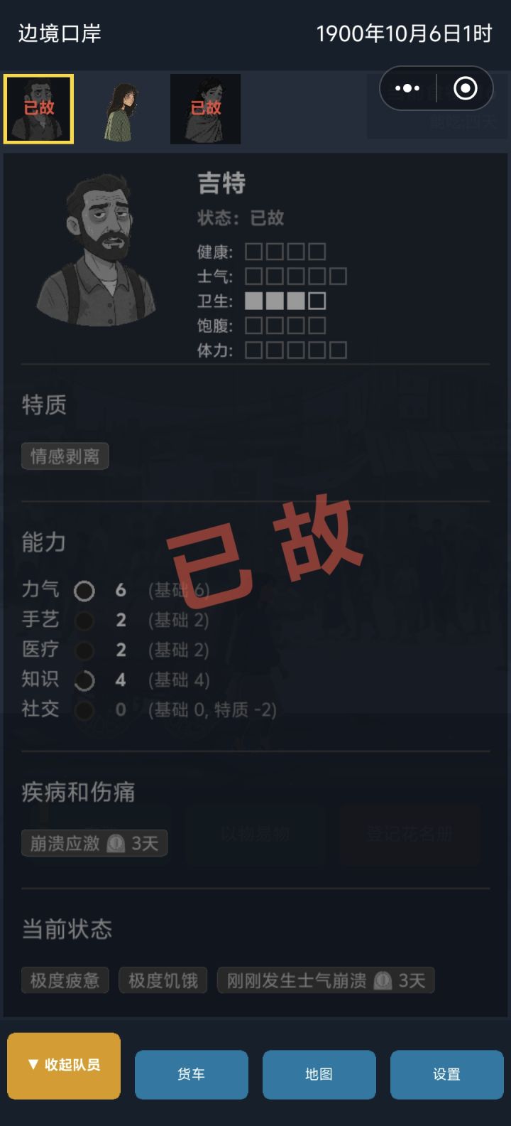 首先在开局刷一个手工4,力气4,社交4的队伍出来,三人其中有一个有知识3就可以算完美开了其次,在前期尽可能早的凑齐10废料做渔网,小刀看个人,中期想做就做,我记得有一个藏宝图支线会给一把,乐器没有,一口酒3天+2士气,完全够用路线上,100kg食物够你穿行4/5个点,尽量不让食物低于50kg的底线,不然容易翻车背包上,废料是好东西,造了渔网也不嫌多。药和衣服带一组,这样算下来还有4-6个格子
