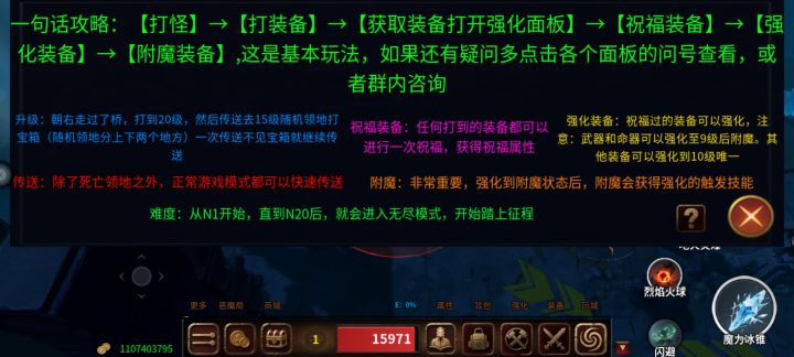 1:进入游戏选组队模式,选个自己喜欢的角色,打开背包有送两件新手装备(每次开始游戏都会送)点开背包旁边的强化,把装备拖到祝福的格子祝福一下增加词条(每件装备都可免费祝福一次,祝福数值和词条数量由通关最高难度决定),祝福完点右上角传送去最下面的传送点刷到20级(最终boss是二十级解锁,消灭后解锁下一个难度,传送列表可以直达)之后传送到20级boss地点往右下走就能遇到了,打不过就走位拉扯,顶不住了