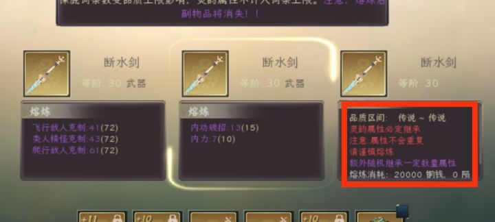 注释:熔炼,游戏的基础玩法之一,用来给装备洗额外词条(装备熔炼无视补位但是会依照装备的词条基本逻辑,不会出现该部位装备没有的词条)1:护腕,上衣,护腿,鞋,可以出现以下词条飞行敌人抵抗根骨抗会心 类人精怪抵抗力量 耐力 内功招架 内力 爬行敌人抵抗气血 人形敌人抵抗生命恢复速度外功招架 元素敌人抵抗可以根据自己的职业选择自己合适的词条2:武器,项链,戒指,腰带,可以洗出以下词条飞行敌人克制根骨