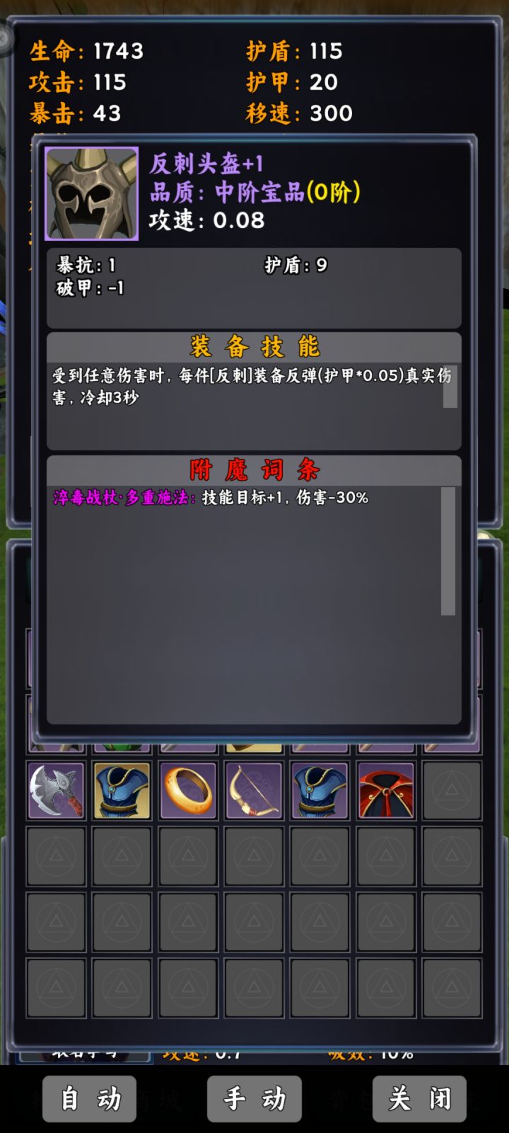 盾战的伤害随护甲值提升而增加。在装备选择上,应着重堆叠护甲,推荐搭配反刺肩甲、玄铁胸铠和反刺护腕,附魔和药品则以增伤为主。白色装备(凡品)仅有技能,无词条属性,品质越高,词条越多,高难度场景掉落的装备阶级也越高。在大世界中获得的高阶装备,回到小世界时,若玩家在小世界的进度不足,则无法装备该装备。玩家可选择强化绿色(法品)0阶单词条装备,将其作为“传家宝”。高阶装备词条属性更优,首领装备词条数量更