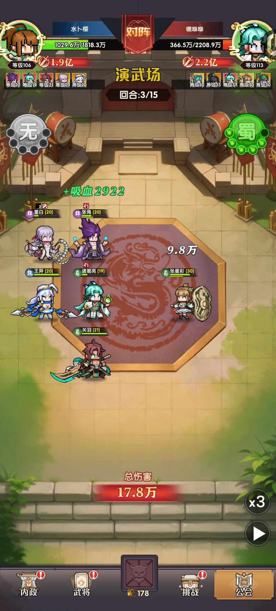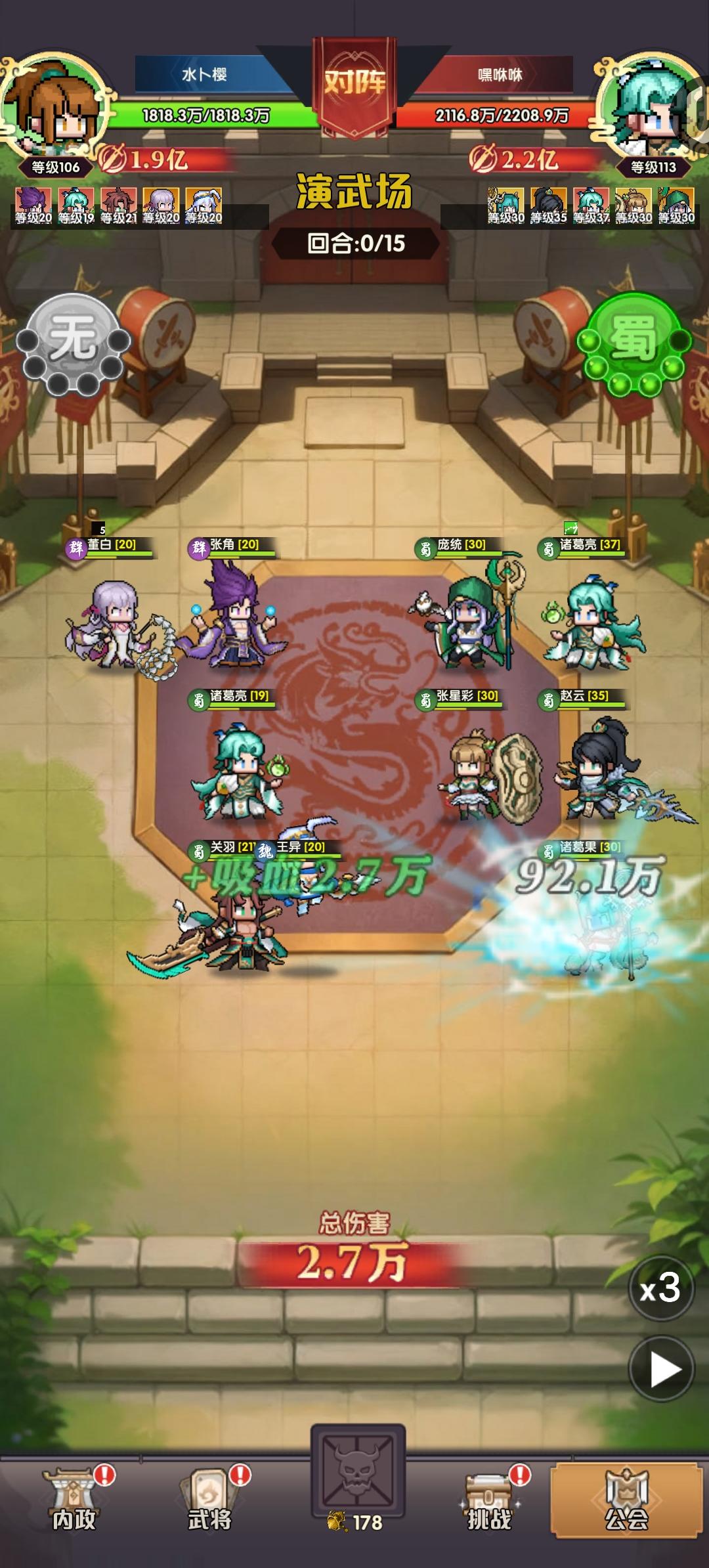 今天刚玩的 自己摸索出来的阵容 因为抽了两个诸葛亮 大招稳定秒除了BOSS外的一个 输出还是很给力的 前排我用的张星彩 大招无敌期间受到的伤害 可以治疗血量最低的单位 比较好用的前排了 前面蓝色紫色的能升星就升星 战力加成比较多 吴国是灼烧流 没有抽到主力 效果现在不了解 可以根据自己第一个抽到的主力 选择心愿英雄 决定自己玩什么阵容里面的各种礼包也很给力 喜欢的可以氪点礼包什么的