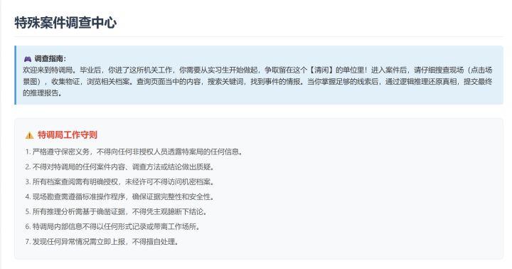 创作者的话用闲着的时间简单做了点网页游戏,bug可能会很多。 因为自己脑子不太够,所以解谜也很简单,没什么复杂的内容~用的这个世界观也是因为本格解谜做不出来hhh 希望玩的开心! 如果玩的不开心可以直接关闭点×! 没有非常复杂的交互,也没有漂亮的页面和图片,只有一个简介的页面供您查询。 更新了第四案~