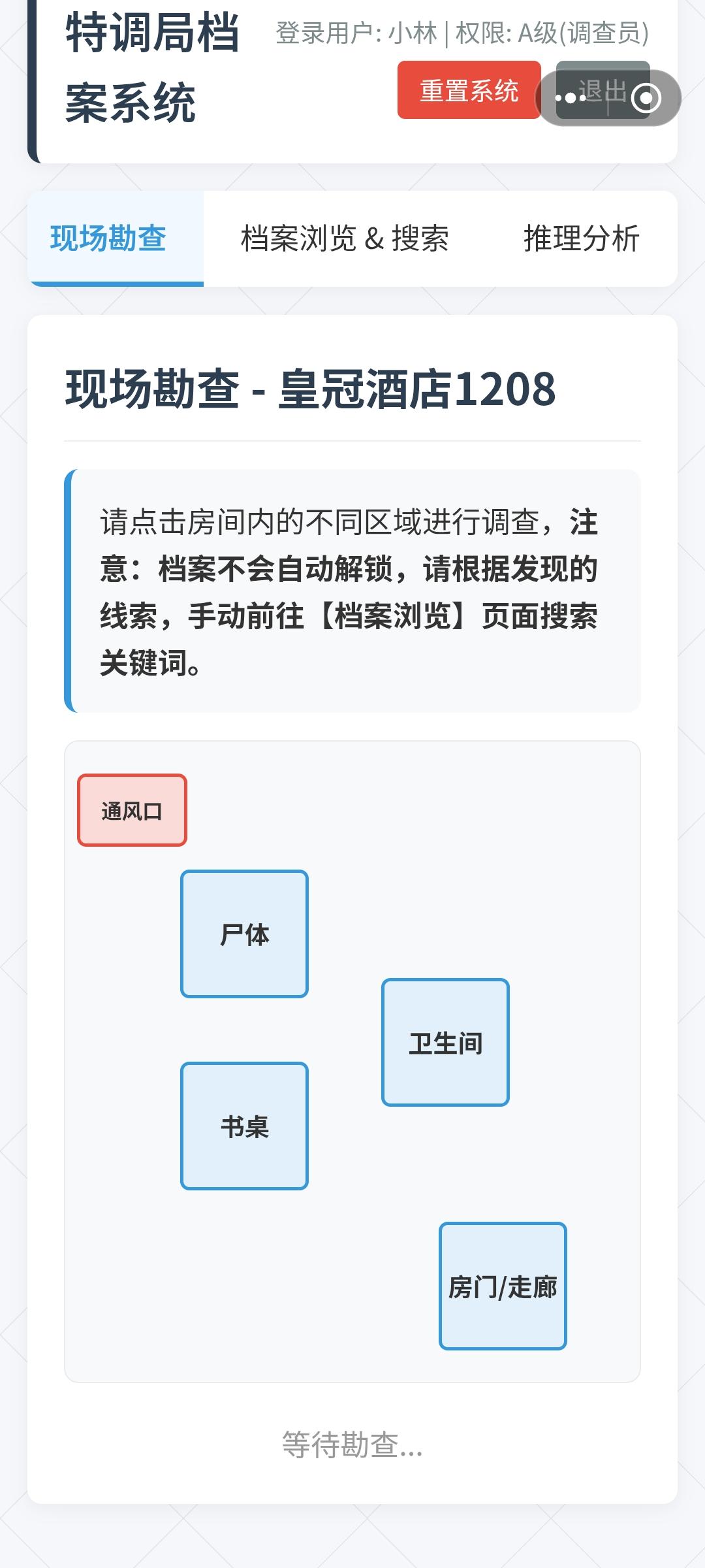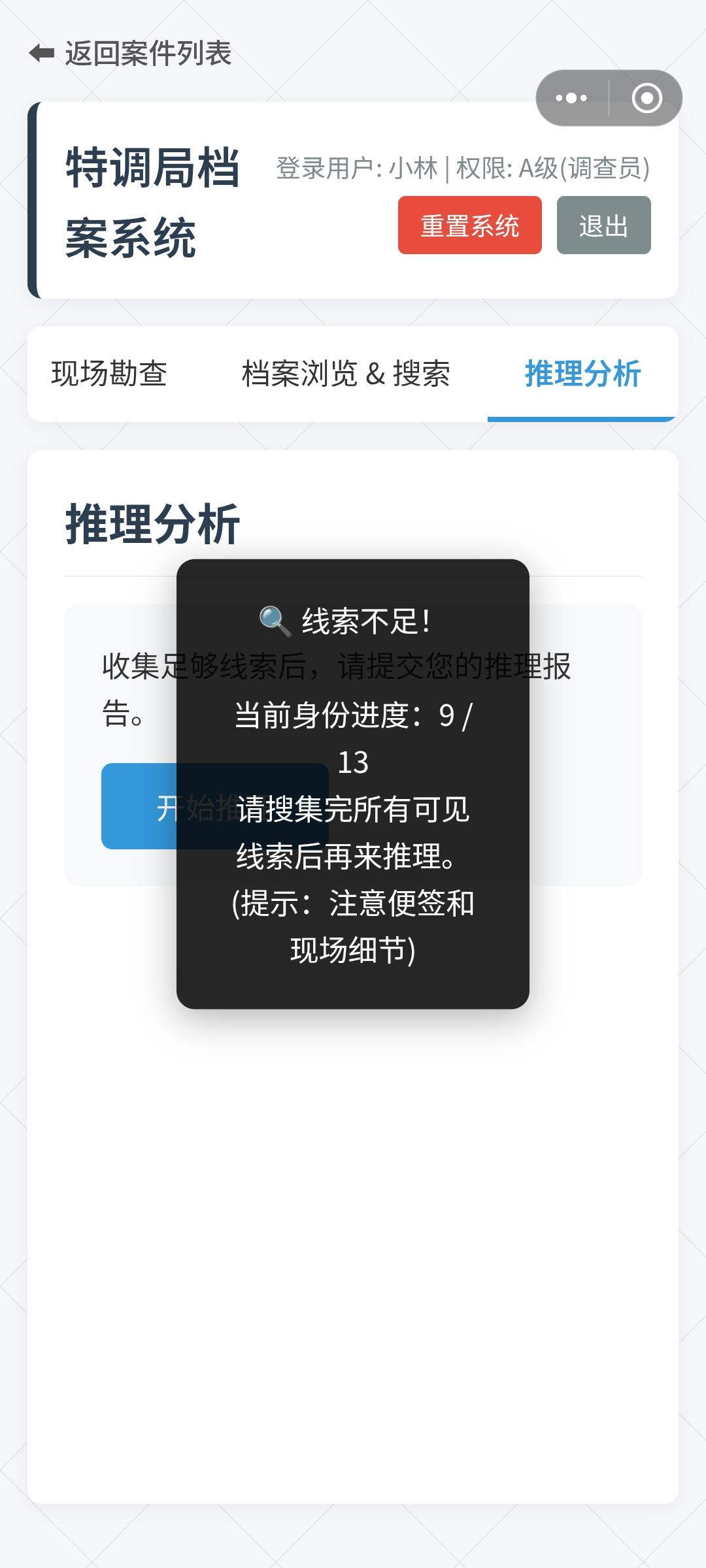 提示的话感觉可以多加一点,至于档案的搜索……有点分不清楚第二案的那种关键词更好,还是像第一案那种可以钻空子的更好。主要吧,关键词只要错了一个字就找不出,但是也确实可以加点难度,可是搜索时只能一个一个的来又很麻烦