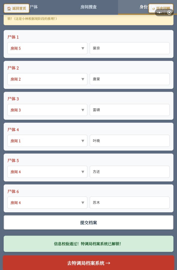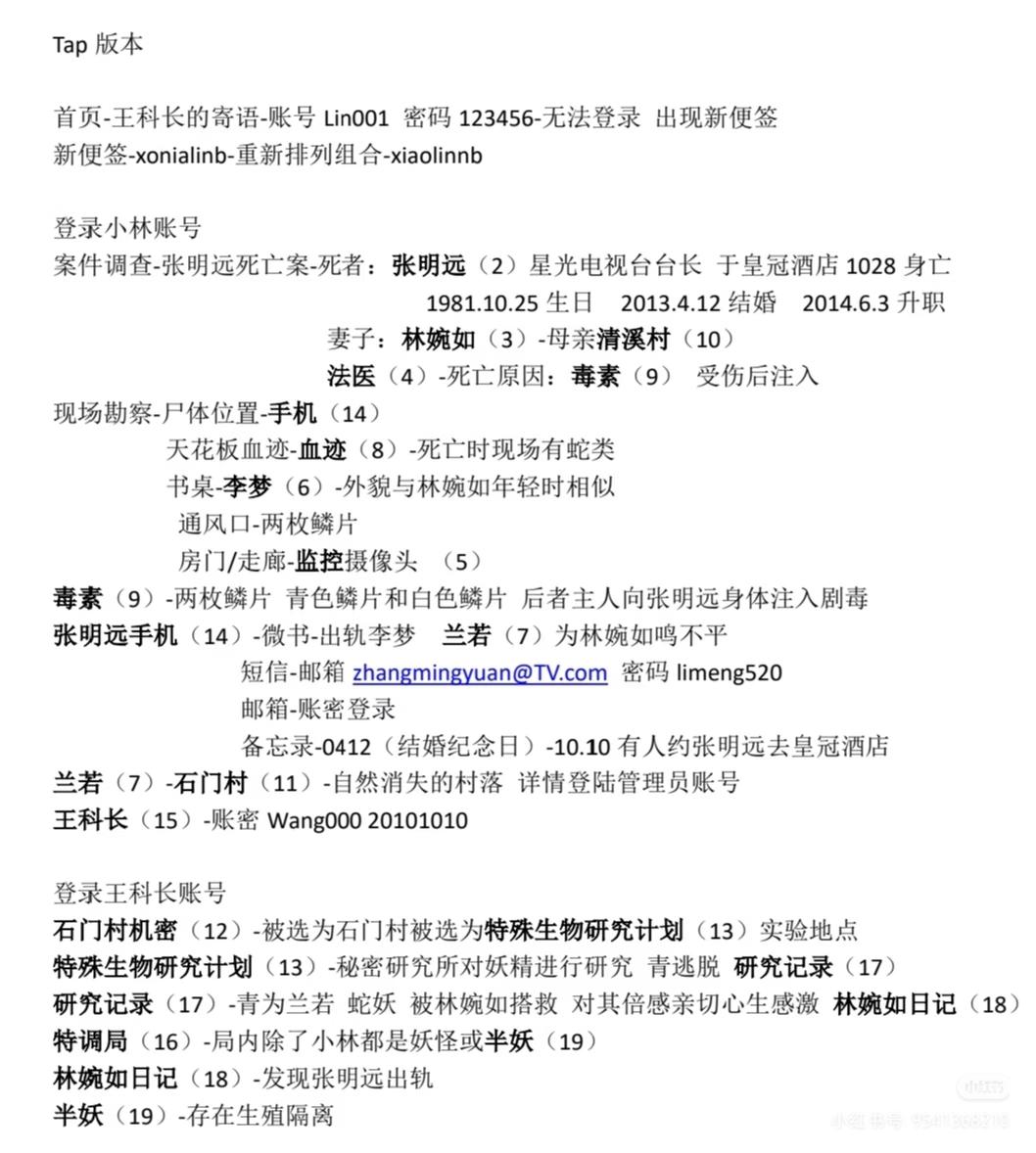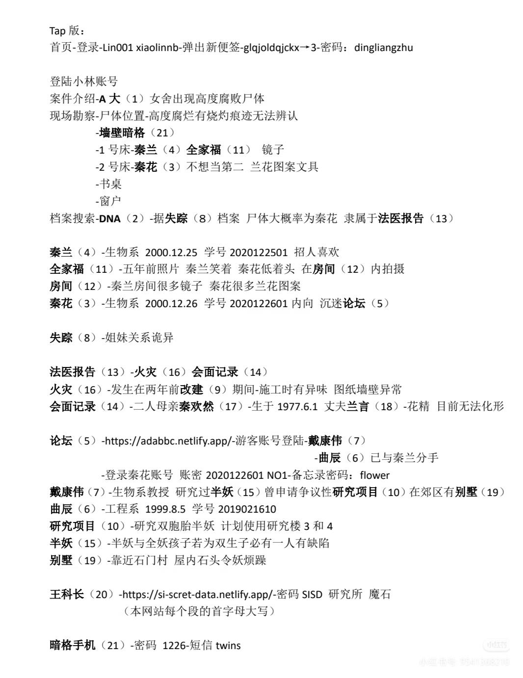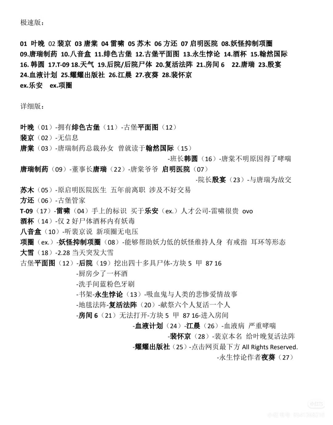 最后知道更新的我be like:着急忙慌拿三台设备写攻略,写完大纲后发现字数严重超标,正文放关键词流程,具体分析思路详见图片,辛苦饱饱跟我玩划划手指小游戏啦!这次有前置小任务,先po一下身份对照(以我多年阅读无限流小说的经验,心机哇后面忘了),具体分析详情见图二一轮结果如下:尸体1【房间5,裴京】尸体2【房间2,唐糖?(空格)】尸体3【房间3,?(空格)】尸体4【房间1,叶晚】尸体5