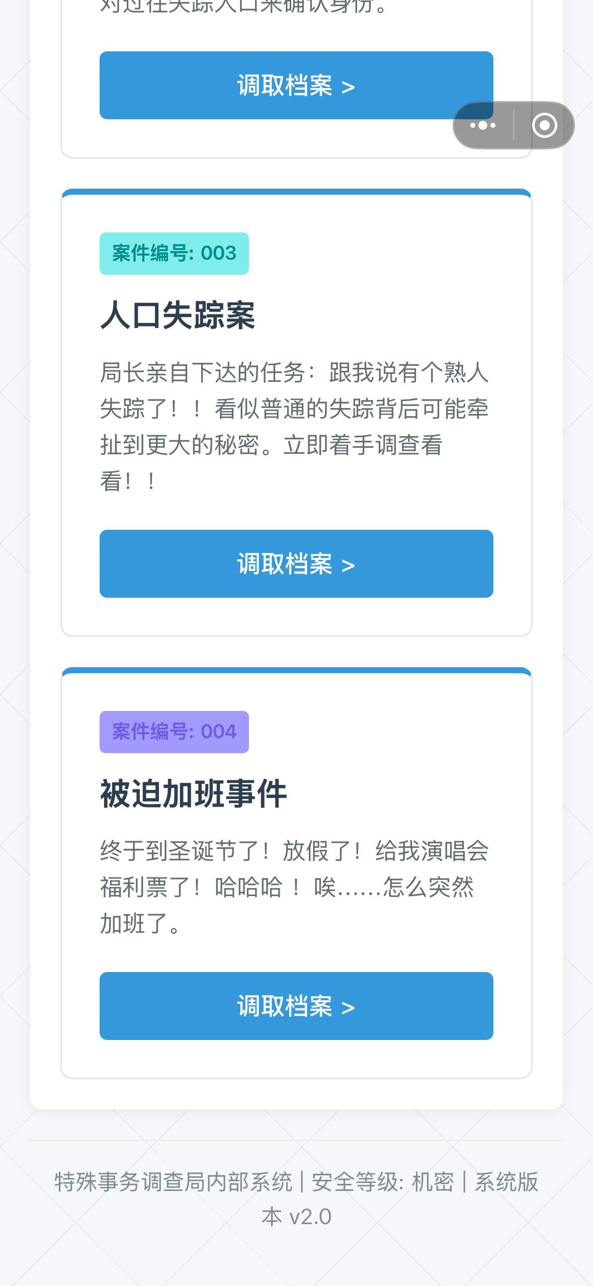 更新了案件4。部分屏幕大小可能不适配。本案件共有14个线索。本案件设计一部分同性恋情描写,介意的话请不要点开第二个结局故事查看。