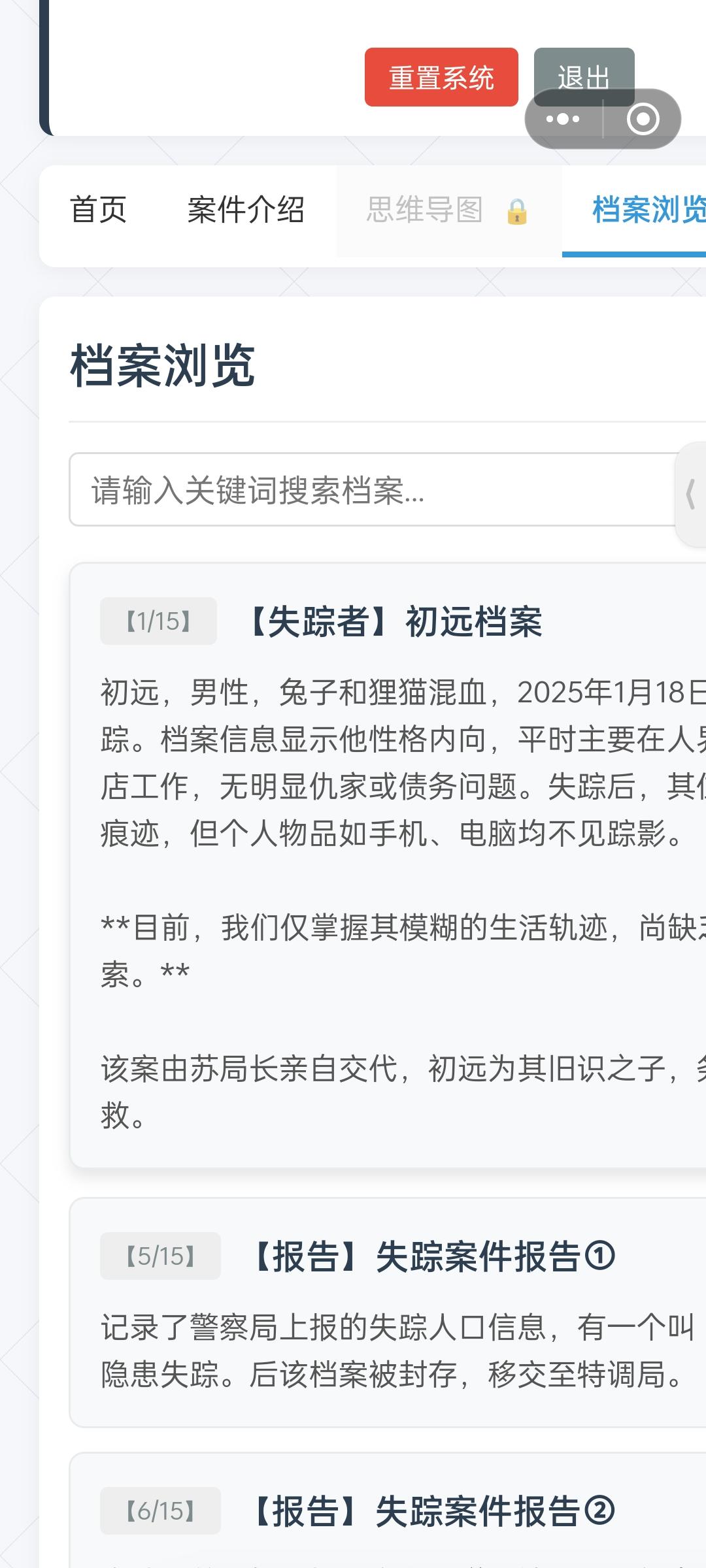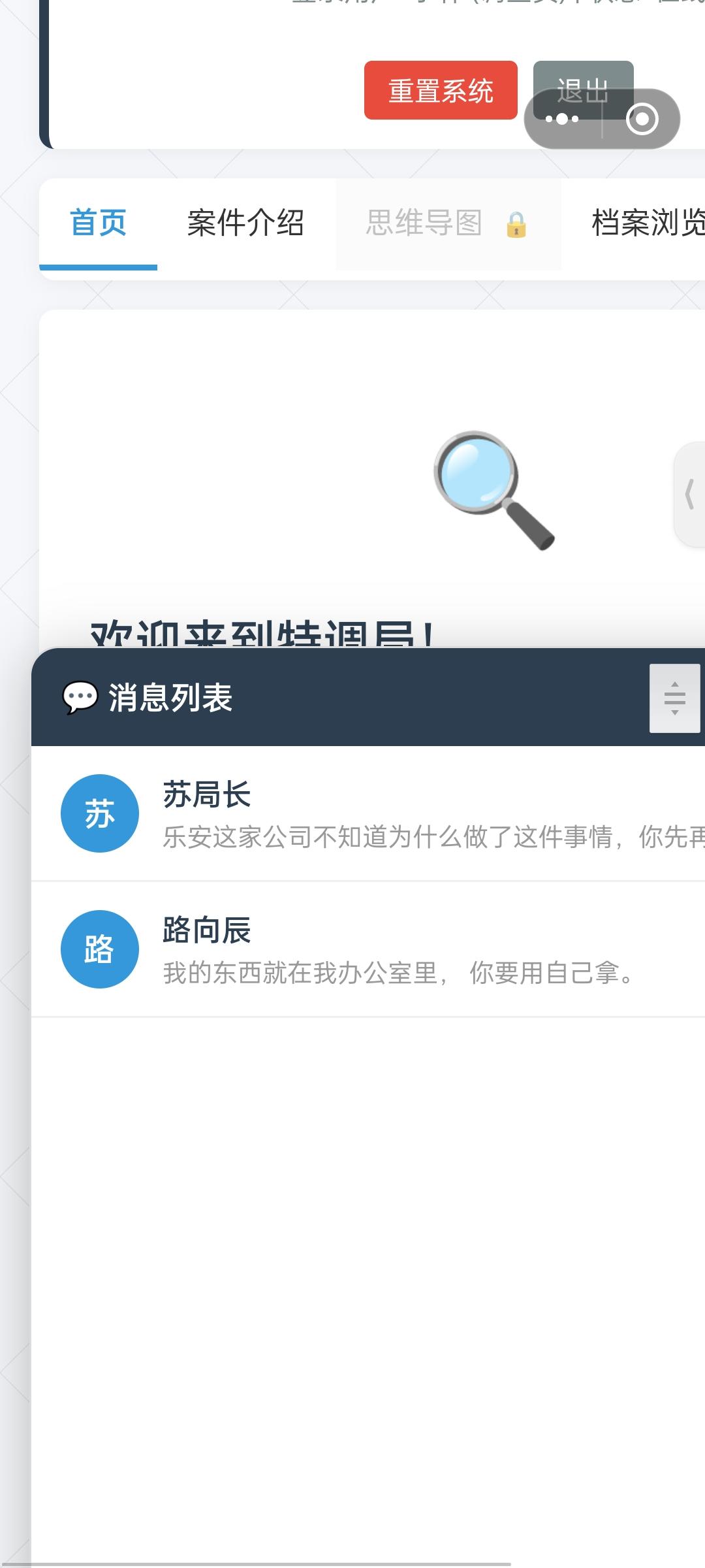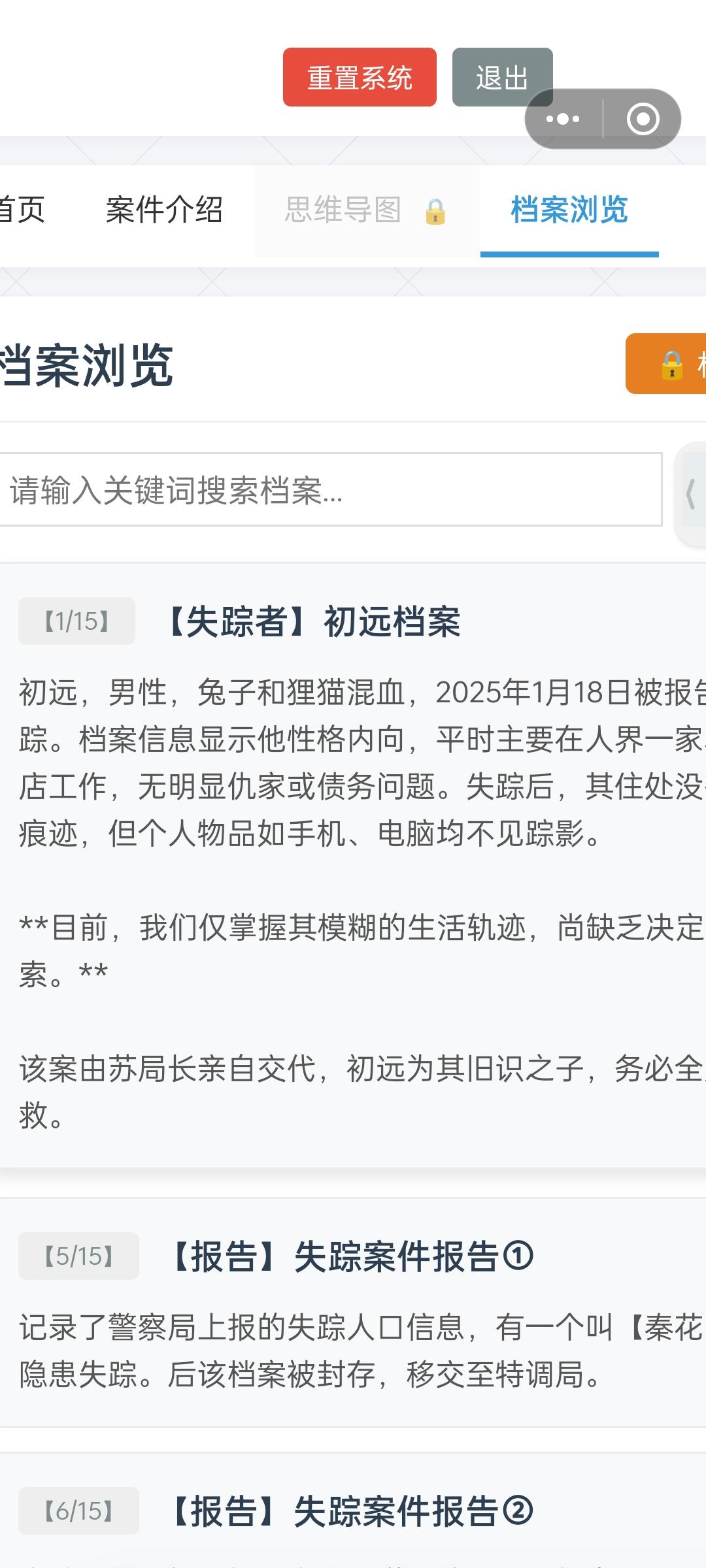 为什么第一章案件告破了,最后只能结束并重置,没有纯退出的选项吗?很想作者出个结案案件归档功能,把解决过的案件结案归档了……不然每次进来看都感觉自己像是没做完,每次进去都可以重新推理一遍,就很离谱……