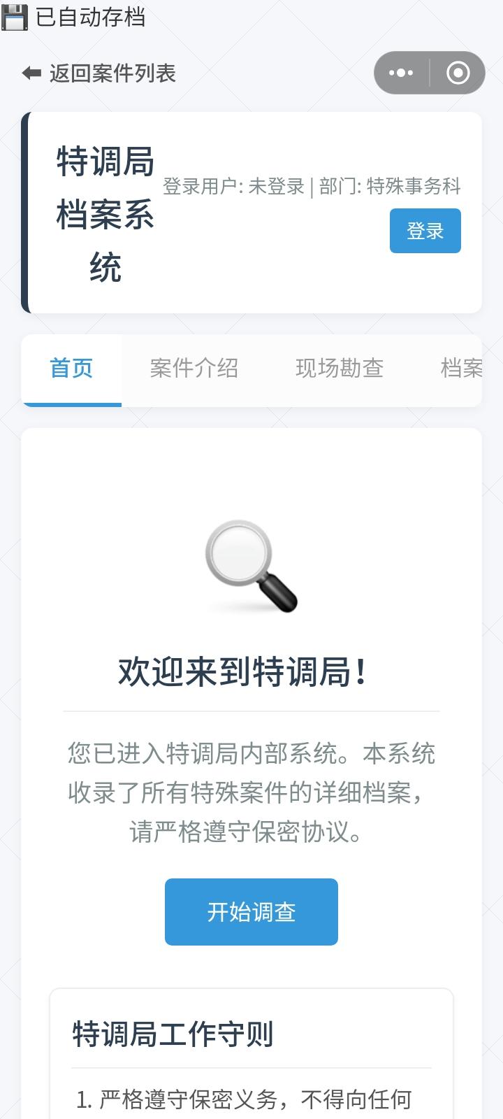 点击即玩。案件5建议拿笔记一下!信息有些多。可能有些小bug,可反馈,我慢慢修。原案件做了修成,案件结束后不会直接重置。