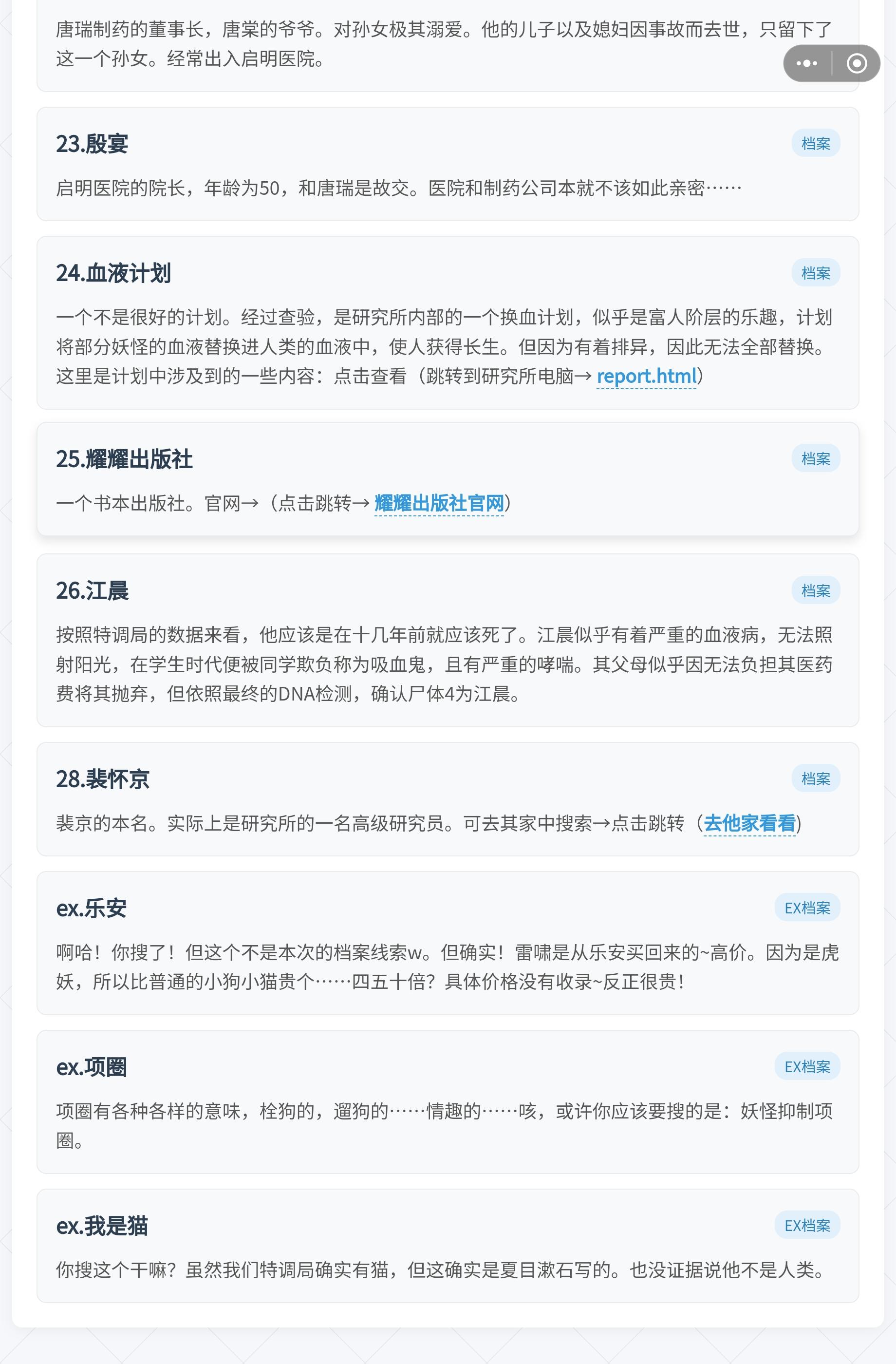 为什么第一章案件告破了,最后只能结束并重置,没有纯退出的选项吗?很想作者出个结案案件归档功能,把解决过的案件结案归档了……不然每次进来看都感觉自己像是没做完,每次进去都可以重新推理一遍,就很离谱……