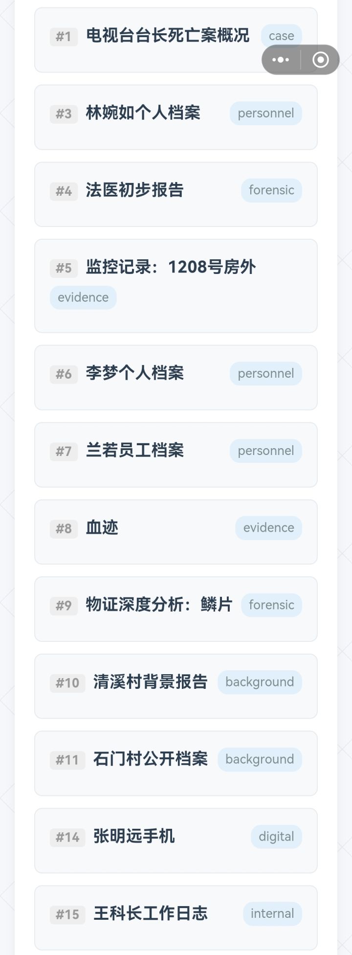 游戏每个人习惯不一,这里放的是个人解密过程♥(。→v←。)♥1.登录账号:Lin001→输入初始密码提示更新密码(xiaolinnb)2.根据案件介绍得到关键词【#2张明远】【#8血迹】3.根据现场得到关键词【#5监控】【#14手机】【#4法医报告】【#9鳞片】4.查看【#2张明远】,得到新的关键词【#3林婉如】→查看得到【#10清溪村】【#7兰若】【#6李梦】→查看得到【#11石门村】(