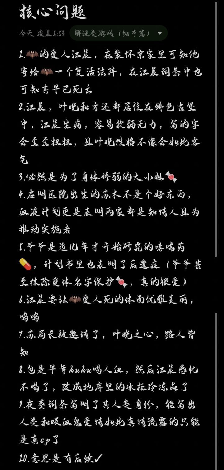 最后知道更新的我be like:着急忙慌拿三台设备写攻略,写完大纲后发现字数严重超标,正文放关键词流程,具体分析思路详见图片,辛苦饱饱跟我玩划划手指小游戏啦!这次有前置小任务,先po一下身份对照(以我多年阅读无限流小说的经验,心机哇后面忘了),具体分析详情见图二一轮结果如下:尸体1【房间5,裴京】尸体2【房间2,唐糖?(空格)】尸体3【房间3,?(空格)】尸体4【房间1,叶晚】尸体5
