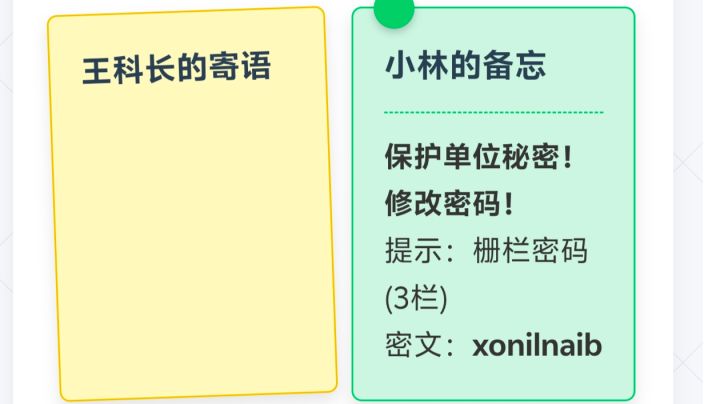 有问题可发评论区,我会回答(如果看到的话),本人是为爱发电,有错请指出!一共有19条信息,T1是我没玩完的时候截的。点进去需要解密小林的账号密码…(什么上来就是一个下马威吗?!)根据王科长的便签得知小林账号为:Lin001,初始密码为123456(这么简单?!)输入后得到小林的嘲讽(什么我不是小林吗?!)然后根据小林的便签得知密码为:xiaolinnb综上,小林:账号:Lin001
