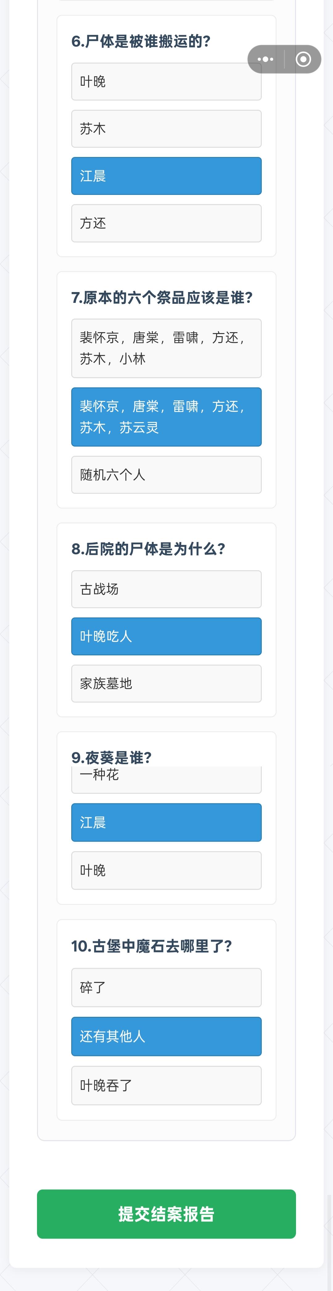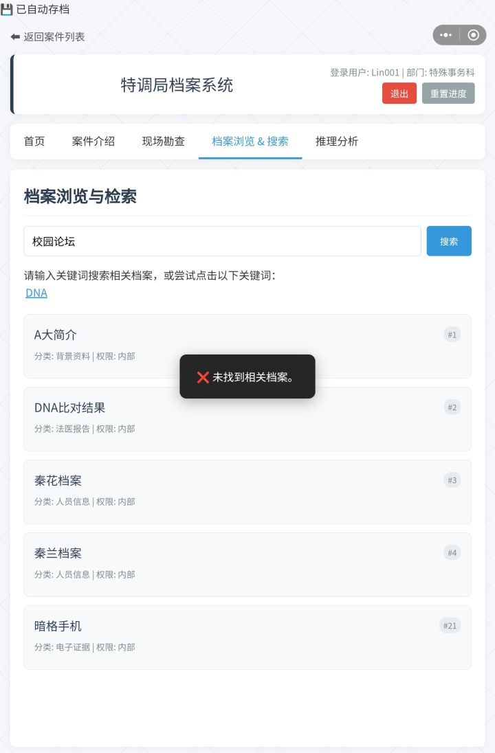 游戏每个人习惯不一,这里放的是个人解密过程♥(。→v←。)♥1.登录账号:Lin001→输入初始密码提示更新密码(xiaolinnb)2.根据案件介绍得到关键词【#2张明远】【#8血迹】3.根据现场得到关键词【#5监控】【#14手机】【#4法医报告】【#9鳞片】4.查看【#2张明远】,得到新的关键词【#3林婉如】→查看得到【#10清溪村】【#7兰若】【#6李梦】→查看得到【#11石门村】(