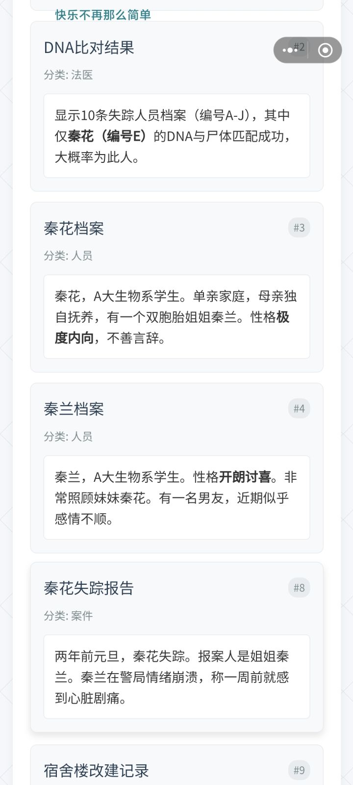 案件二,这里,打错了,是案件结论的地方,秦花→秦兰还有一点很奇怪,尸体腐烂两年了,那这些物证是怎么保存这么完整的,宿舍的物品、论坛的话,还有曲辰闹分手,如果是两年后的事情的话,很奇怪还有秦花秦兰的爸爸,为什么会变成本体,失去人身,好像没有说明