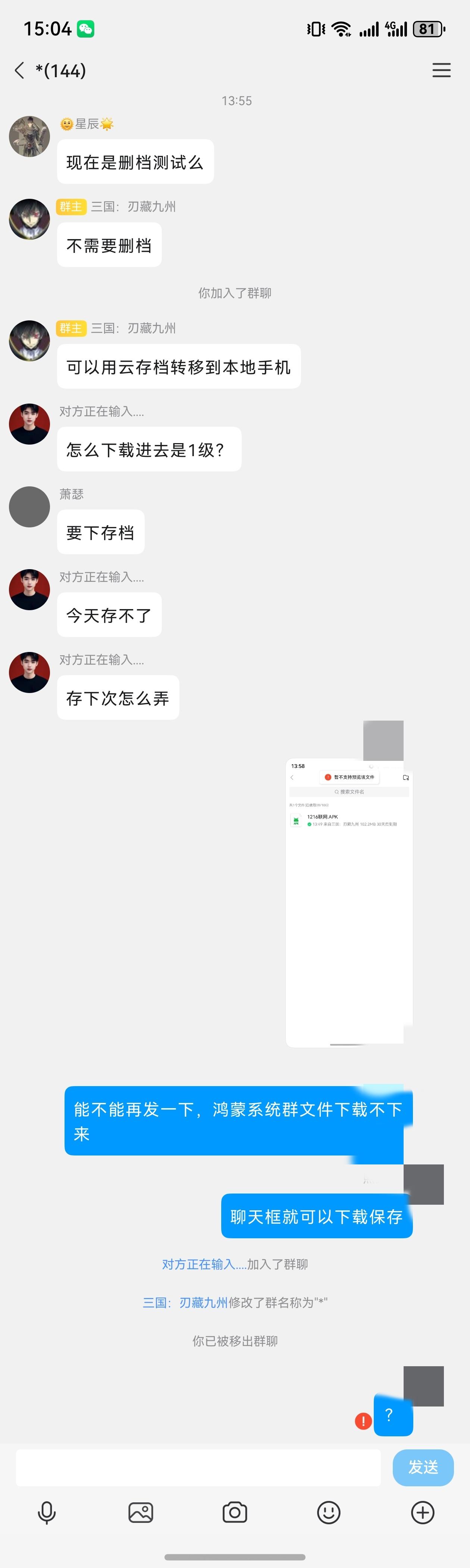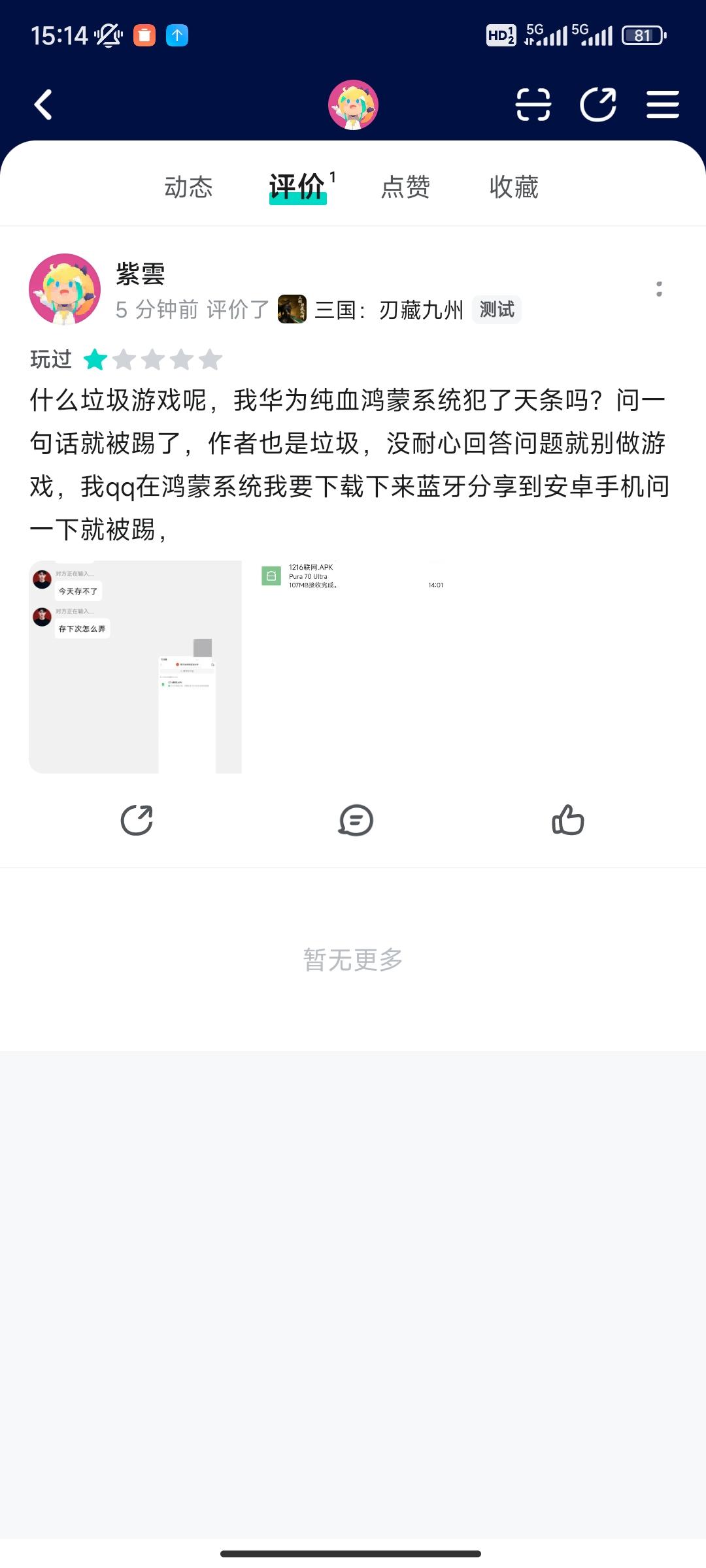 什么垃圾游戏呢,我华为纯血鸿蒙系统犯了天条吗?问一句话就被踢了,作者也是垃圾,没耐心回答问题就别做游戏,我qq在鸿蒙系统我要下载下来蓝牙分享到安卓手机问一下就被踢,第一次对游戏的评价送你