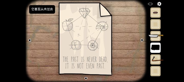 1.先四处观察一下,房子在湖面上、还有钓鱼支架,这好像是一间湖上的小木屋,接下来我们寻找线索吧。桌子旁获得鱼线和鱼竿 1.12.抽屉里获得小刀 2.13.点击房间上方的黑色三角箭头,获得天花板上的虫子,从劣迹斑斑的墙上我们可以大致猜出这间小屋已经荒废很久了 3.1.24.点击左边箭头,窗户左上角获得纸片,上面写着“过去不会消亡。甚至依旧存在”还有五角星形状的图形,让人感觉像个阵法,不管先