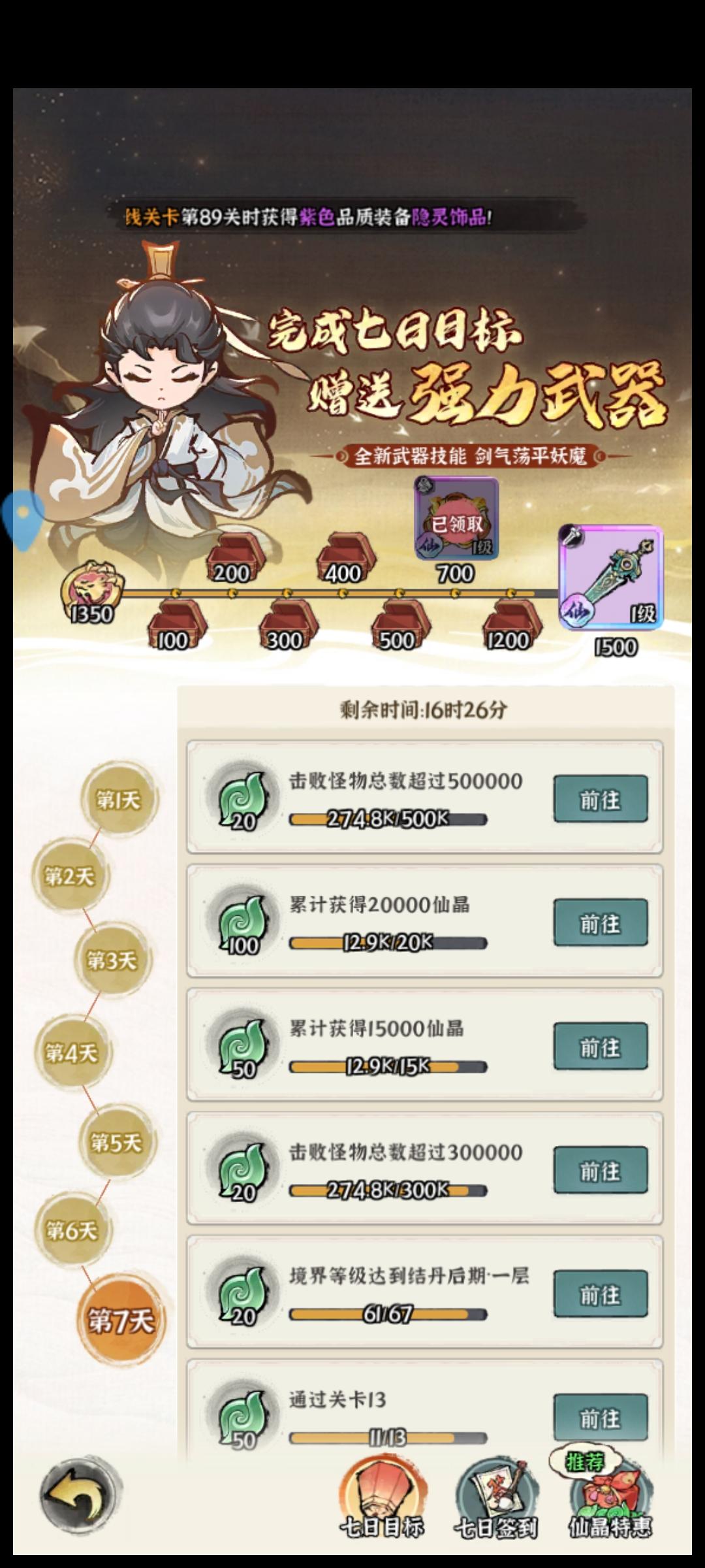 首先这是一款打发时间的小游戏,适合休闲玩。新手七天十分重要,游戏福利较好。新手七天需要注意什么!十分重要。1:资源不要乱用,特别是仙晶!通过主线和主线挑战,以及游戏论坛礼包,是积攒仙晶的重要途径,当然也可以适当购买一张月卡。2:角色培养,新人微氪,可以考虑先培养逍遥,逍遥到了三星,就可以通过很多关卡挑战,然后开始收集九叔,九叔后期也能用属于控制型超强角色,新手七天福利内可以购买九叔碎片!3