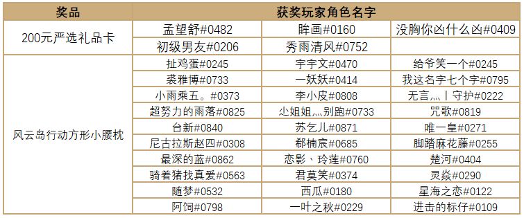 扬帆测试将在1月10日(今天)24:00正式关服,本次测试中的精彩活动“登陆抽周边”和“冲榜赢大奖”也已圆满落下帷幕!获奖勇士中有的技高一筹,有的欧皇附体;有的套路满满,有的浑身是肝……快来看看获奖名单中有没有你的名字吧~ 活动一:登陆抽周边 在【创建账号后的第二天登录】且【登录当天任意段位达到雏羽中段】的玩家中,有5名玩家将获得200元严选礼品卡,30名玩家将获得风云岛行动方形小腰枕,撒花恭喜这