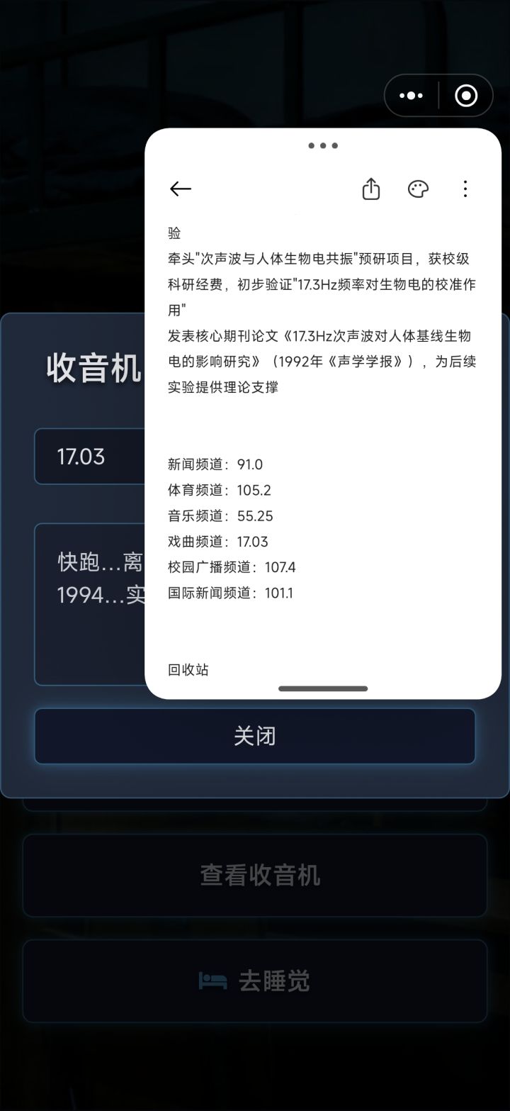 当时最后结局让输一个密码,但是我又点了一个什么别的就跳转到这个结局了,如果成功输入密码会有更好的结局吗,现在这个结局大家都太惨了,一个接一个全被夺取意识,莫然还得帮着再去找下一个容器夸夸作者,超级好玩,整体难度不高,游玩也很流畅,那个收音机戏曲频道的戏曲一出来给我吓麻了,希望作者能继续加油,期待你的下一部作品