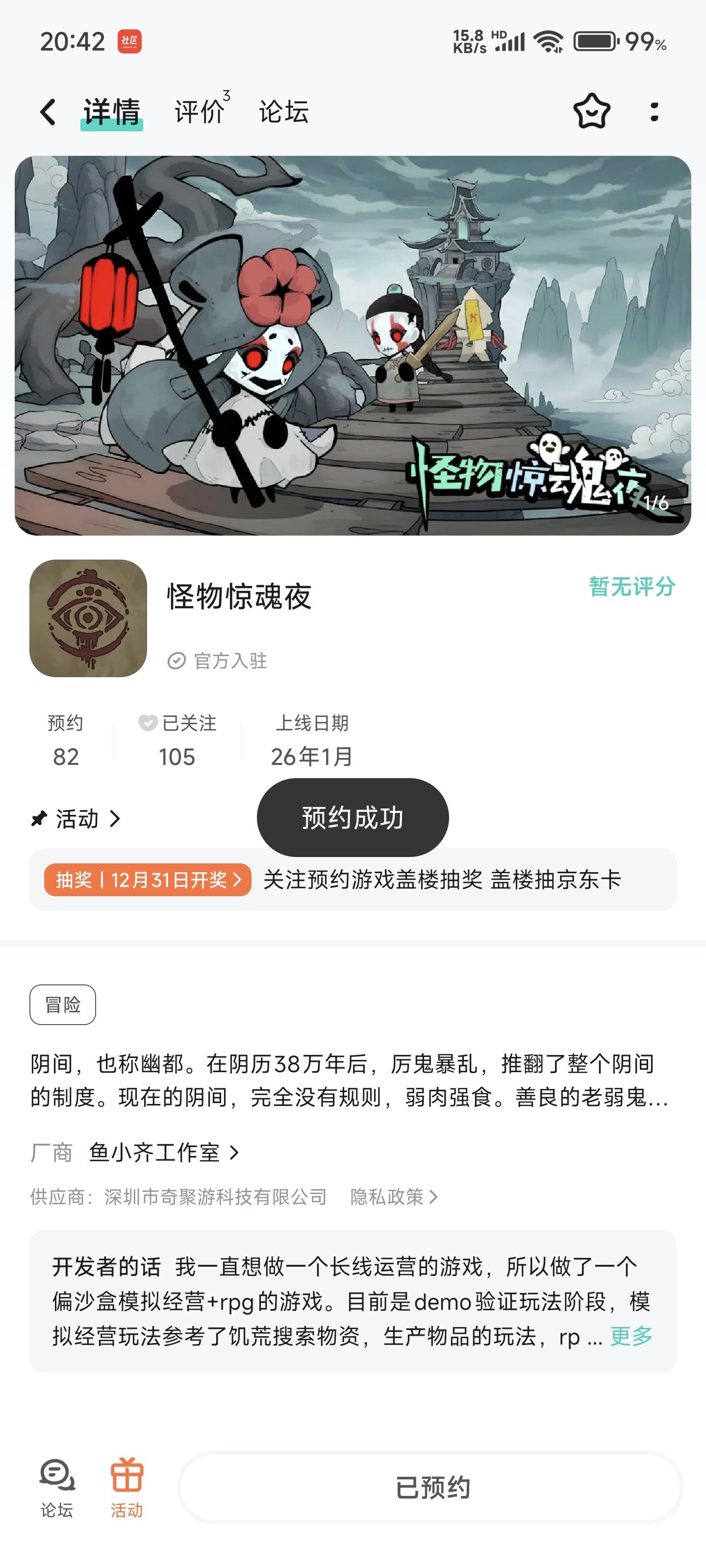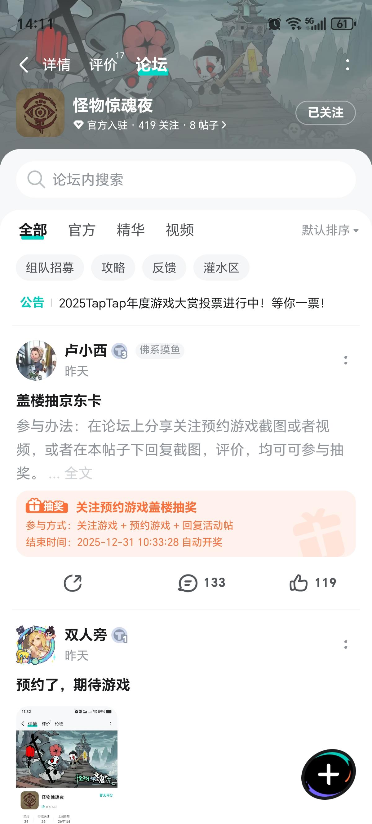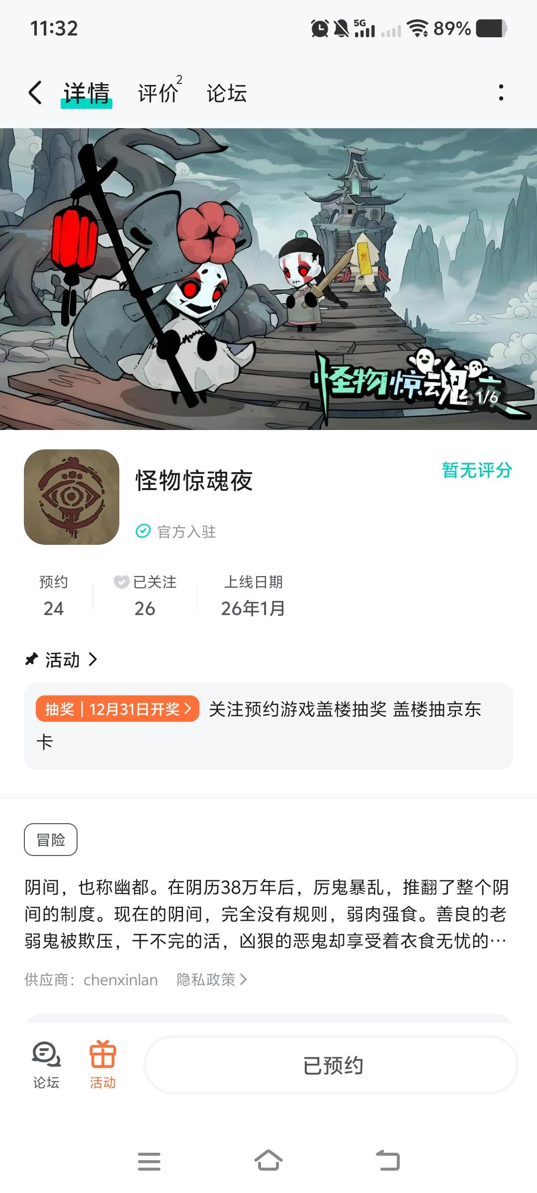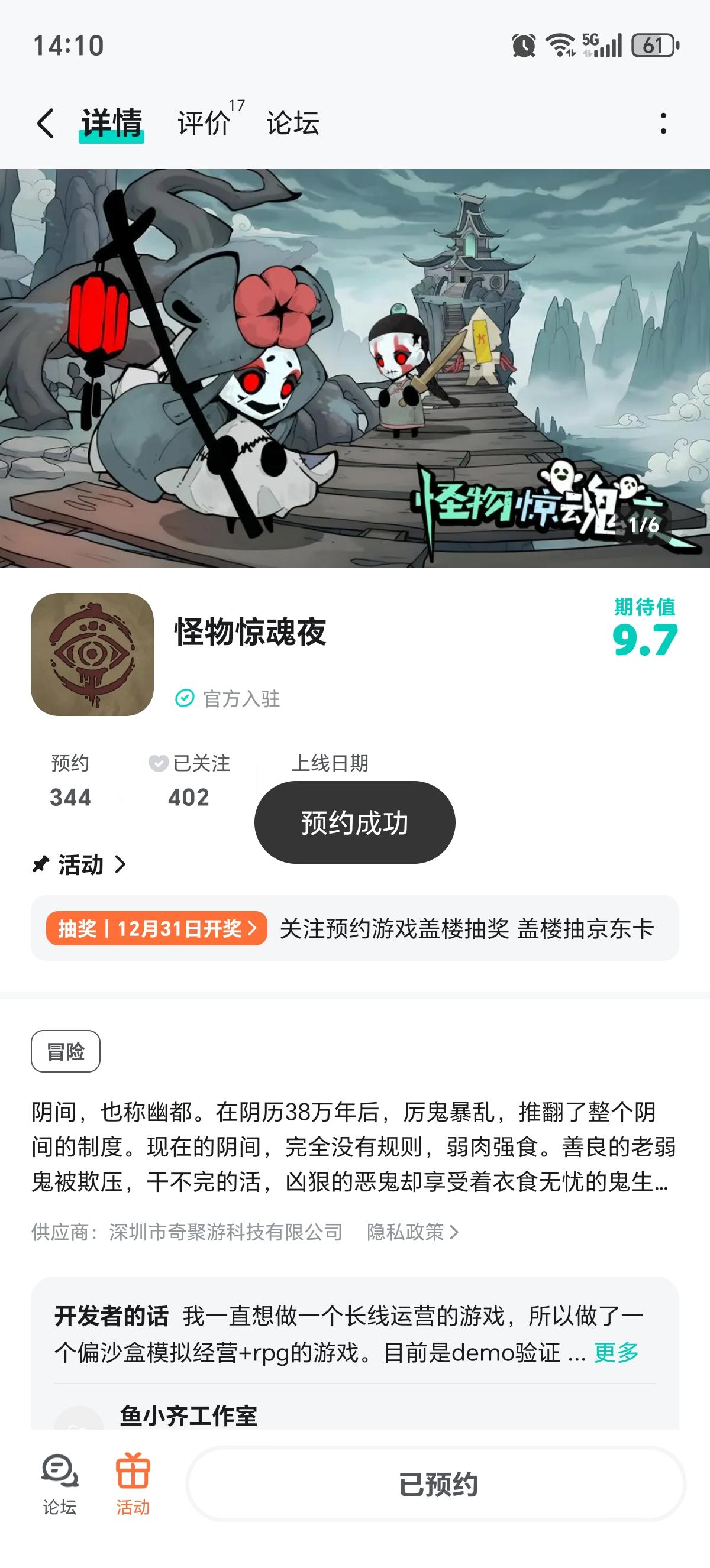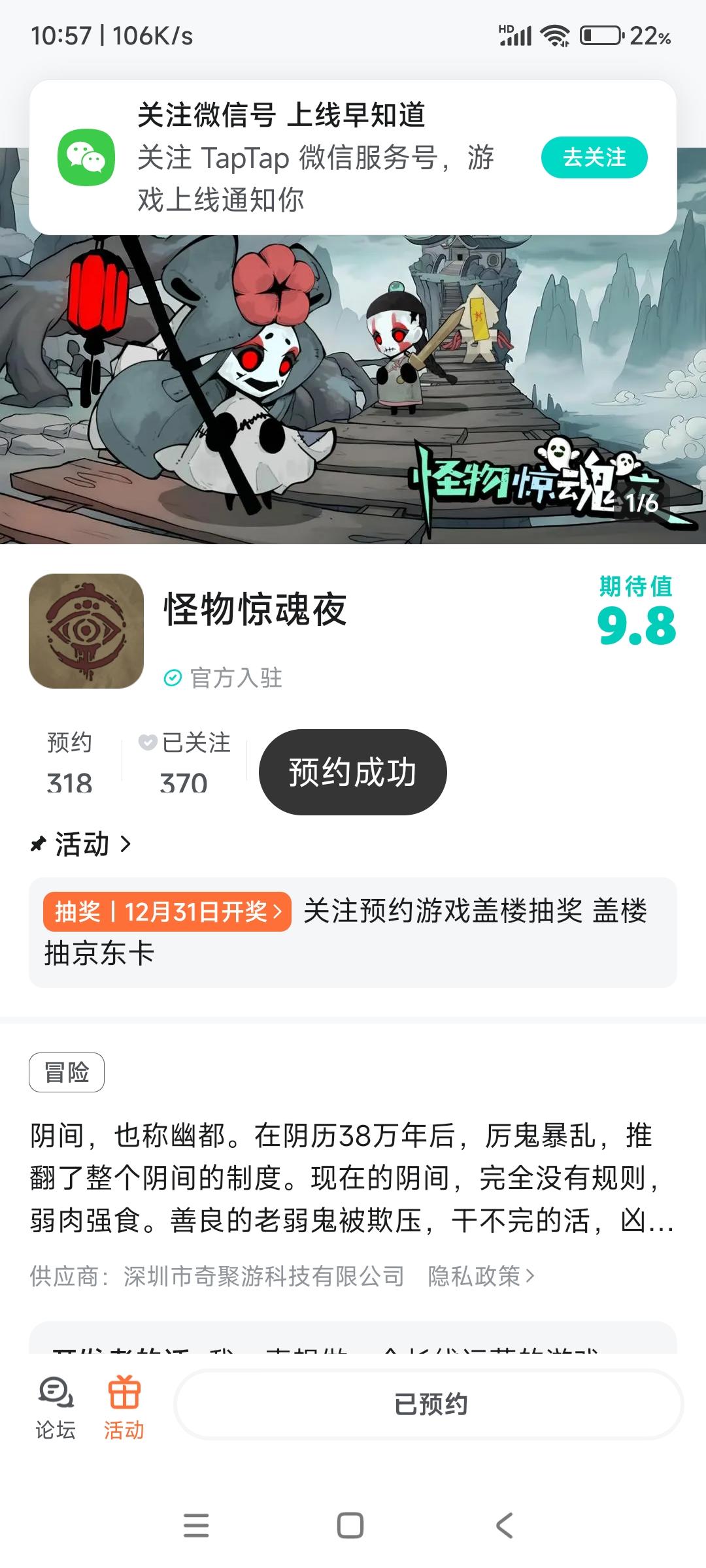 参与办法:在论坛上分享关注预约游戏截图或者视频,或者在本帖子下回复截图,评价,均可可参与抽奖。奖品:100元京东卡*1,名额1个,50元京东卡*1,名额2个,中奖机会非常高啊!时间:12月24日~12月31日注意:1. 本次自动开机中奖。2. 玩家回帖时必须带有相应链接,否则视为中奖无效。3. 每位玩家可重复回帖,不限制多次参与活动资格,可多劳多得。4. 严禁发布涉政、黄赌毒、恐怖暴力