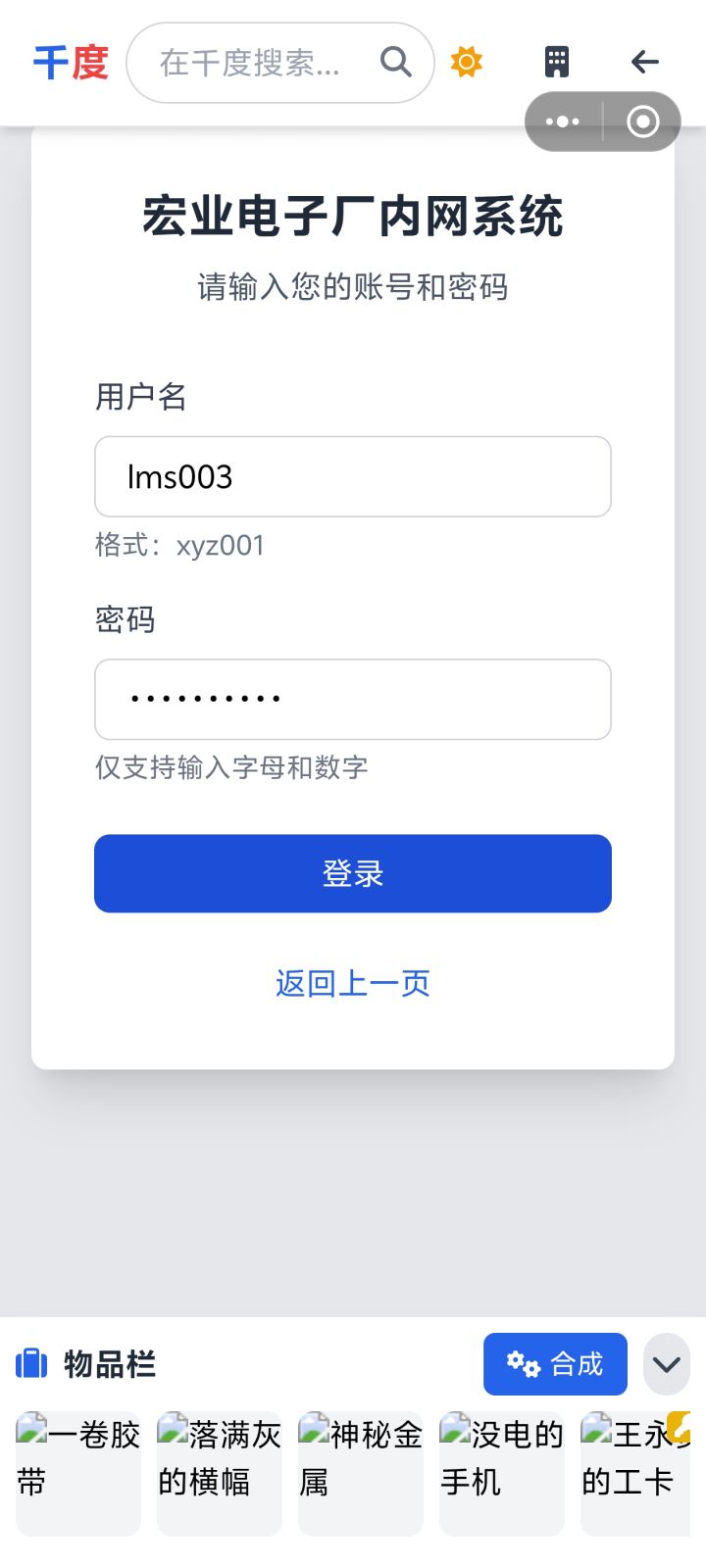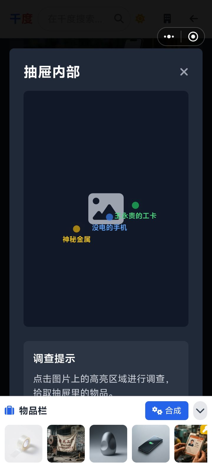 非常简洁的一个界面,就像我们平时手机最常见的那种网页形式呈现。刚进到游戏就会有一个简单的介绍,然后点进去开始游戏之后便会出现可以上下滑动的工厂界面。然后就是好几个图片构成的宏业电子厂大厅。画面都是比较详细的,能够展现一个电子厂的原貌。最底下还有一个物品,然后最上面有一个搜索栏。然后我的手机界面做得比较潦草,就只有简单的四个应用摁了一下备忘录和相册发条件时好像是不能打开的,能开的微信有很多条消息,大概介绍了一下主角现在的任务,总的来说这个画面说不上多出挑吧,但是胜在清晰明了。有的时候画面不需要花里胡哨定一定那个UI要明确也能够知道要表达的东西是什么。还有AI使用的痕迹比较明显。