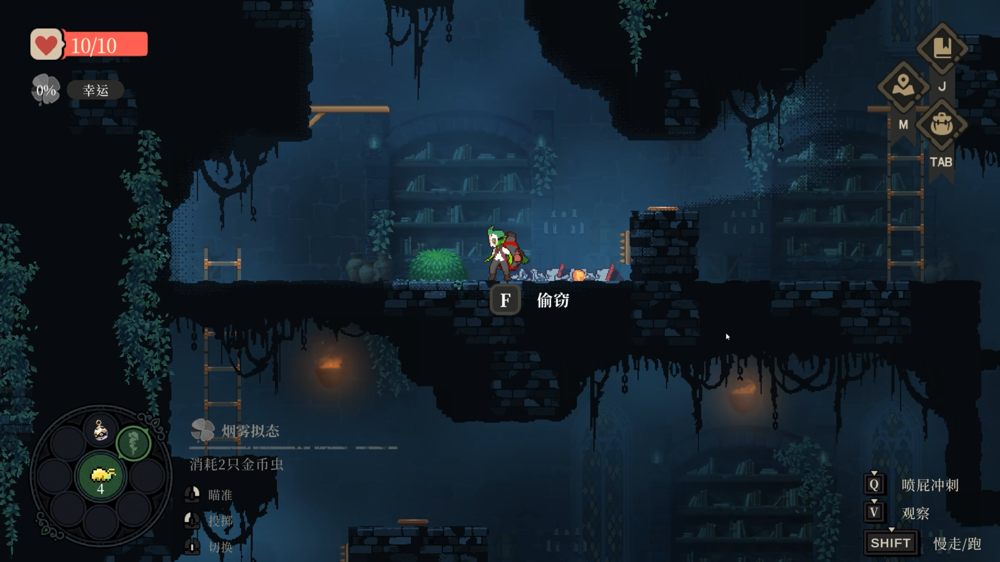可以选择要去的地下城,进入地下城后和大多数横板类银游戏差不多,我们的主角维克能跳能攀爬,战斗主要依靠消耗专注的技巧,地下城也有一些之前探险者的遗体,搜刮一下可以得到不少遗物,洗洗干净就能摆在老爸店里的货架上啦。维克跑起步会有一个范围影响,可能是声波?这种声波会惊醒那些睡着的怪物,压低身形潜伏靠近进行偷窃,完美达成QTE后目标身上的财务神不知鬼不觉的就到手了。整个探险的过程尽量要保证安静不惊动其他人,地下城有环境物利用用来隐藏身形。当然地下城少不了陷阱机关啥的,多看提示,别被发现了。在地下城也会有那些必须要想办法闯过去的地方,比如看守的怪物,可以在地下城都搜集一下金币虫,把金币虫丢出去会发出钱一样的脆响,用来吸引怪物的注意再好不过,亦或者是给怪物的背包里塞一个爆炸人偶,直接送他归西,在回过头来打扫地板。需要注意的是维克虽然身手矫健,但在平台跳跃的时候也要注意一下高度,过高会扣血,还有被怪物发现他跑然后躲进环境物摆脱追踪,这个过程也有可能会挨上几次攻击,身上常备恢复药,以防万一。在地下城找到教堂雕像祈祷一下就可以离开地下城了。