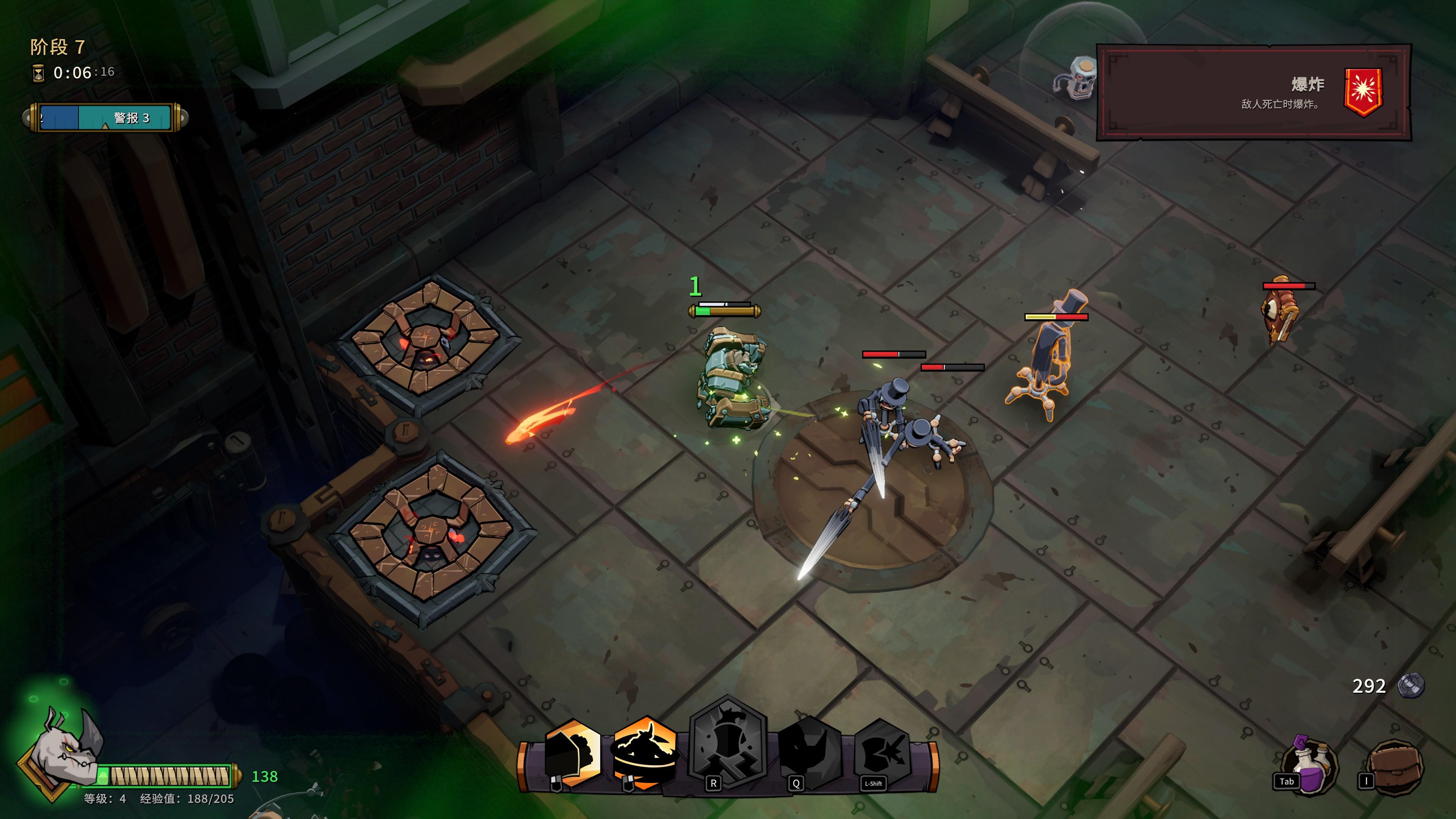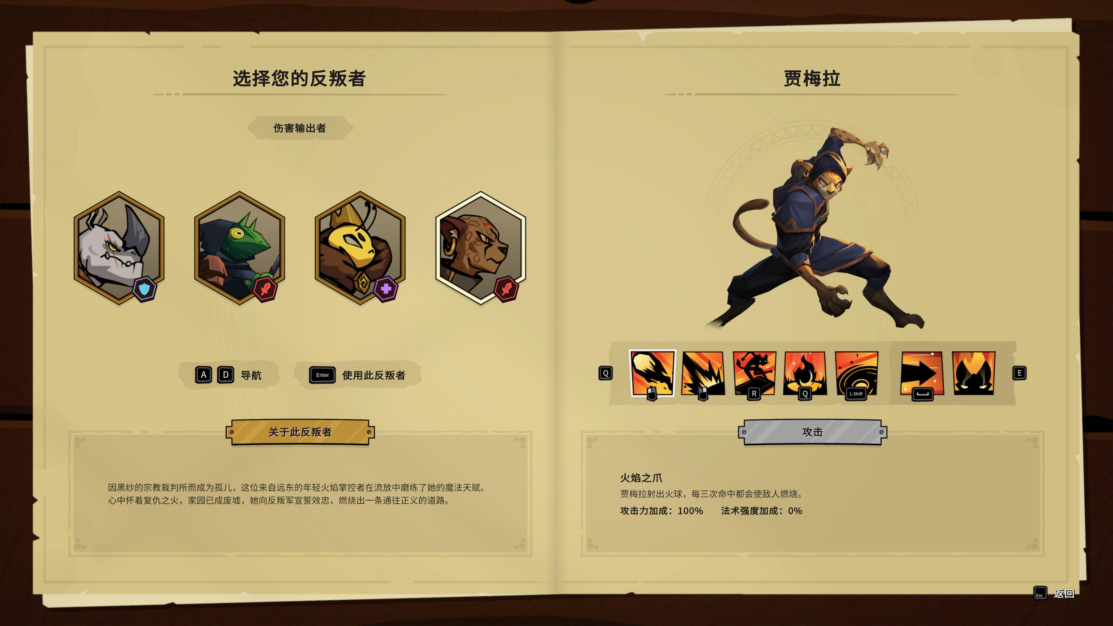 作为一款动作游戏,操作除了wasd的控制移动外,鼠标的左键对用了攻击,可以看作是平a,右键是进攻,可以看作是技能攻击,Q是特色攻击,R是终极攻击,shift是防御技能,还有空格是闪避。除了闪避和鼠标左键的攻击是一进游戏就会的能力外,其他的技能都是在局内升级后升级后习得。