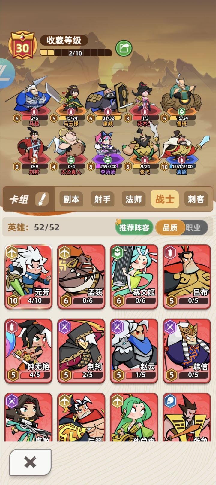 1.6元档除了+⭐️,作用不大2.连胜加分非常重要3.马超要早满级刷被动,第一回合一定要有马云禄,多用李师师刷钱出马超4.自选卡都给刘邦了,目前还没赵云,想玩下刺客,战士有点枯燥5.每天分享可以有10次排位输了不扣分,上王者只要肯打,必上的6.游戏的眩晕是第一神技能,用站位避开眩晕7.论坛有几个大神的攻略写得很好,我是看了才上王者的,感谢论坛的大神