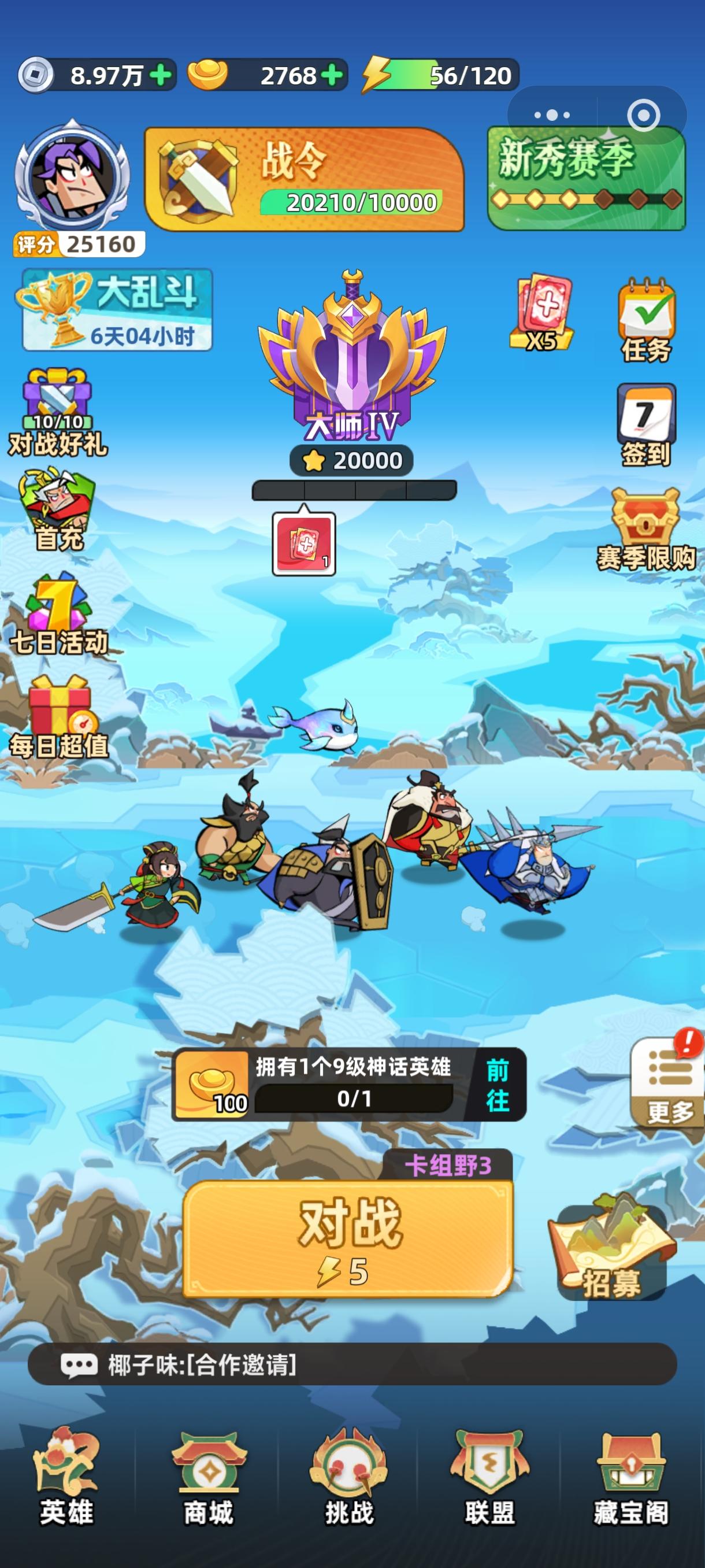 0氪第9天,七天活动结束,段位大师,看看赛季末冲个王者。这游戏0氪微氪玩不了一点,攒一个9刘邦不知道要多少个赛季,9刘邦才入门。我这抽卡还算是幸运的了。自选上到王者还能攒到8张。